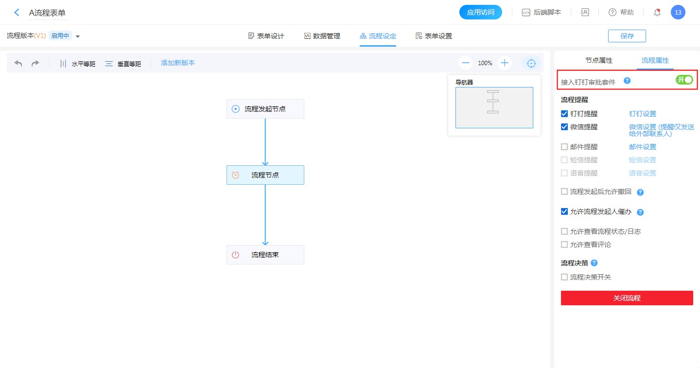 1、流程设置需要开启【接入钉钉审批套件】