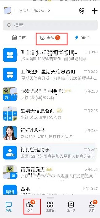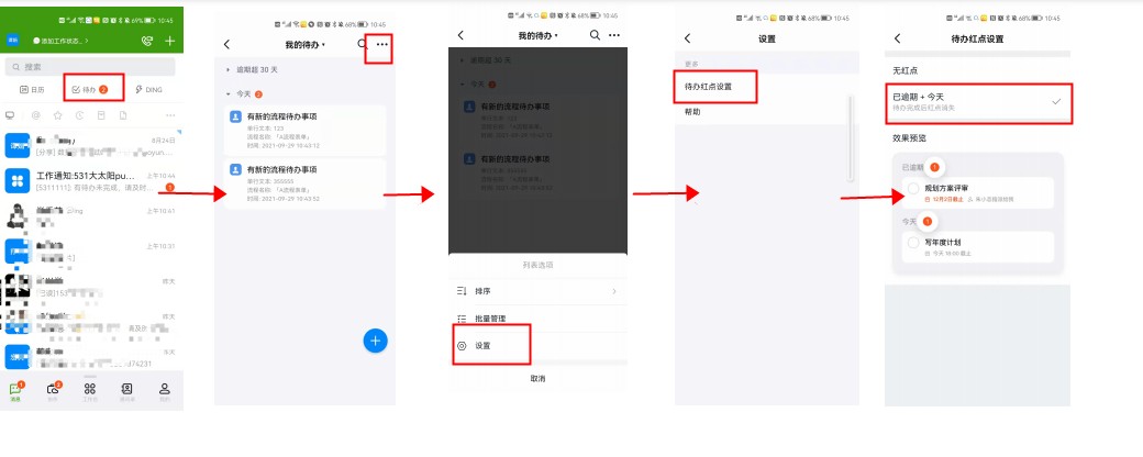 2、钉钉端要开启待办红点设置,以手机端钉钉为例:
