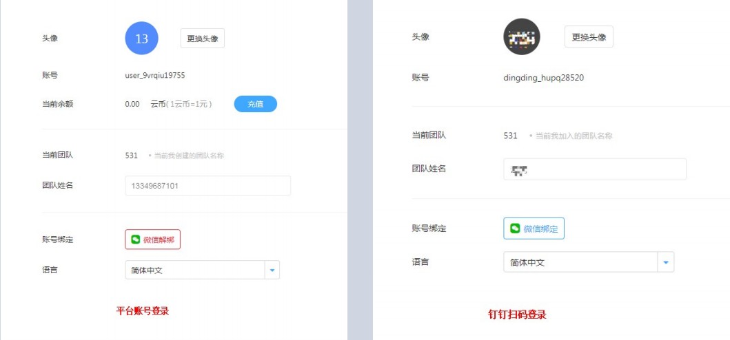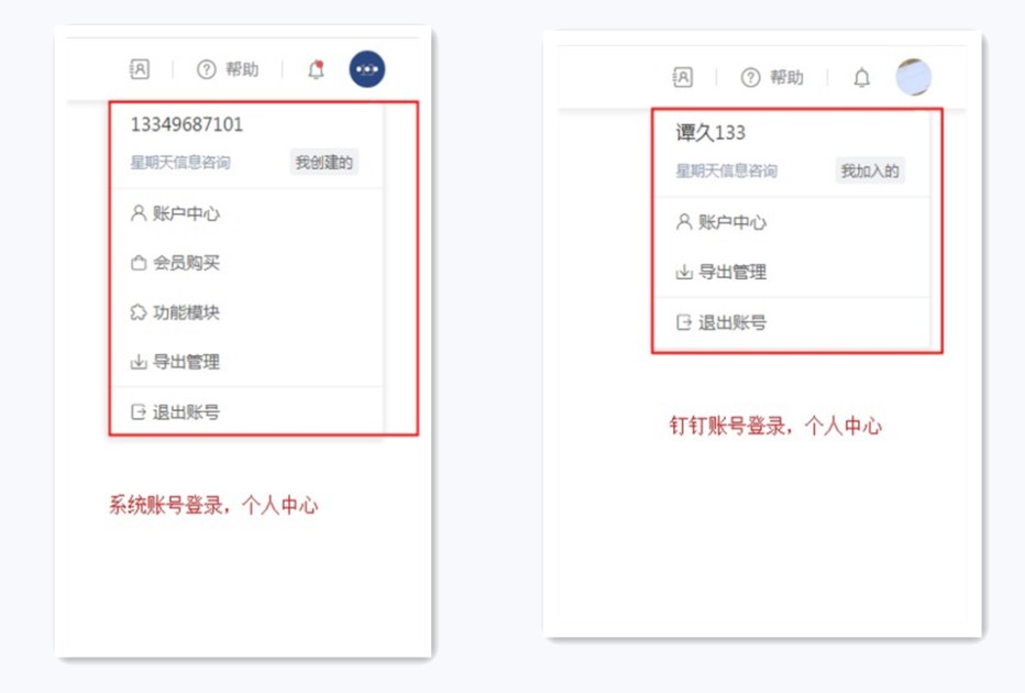 闪搭账号和钉钉扫码登录系统,在个人中心的功能不一致。