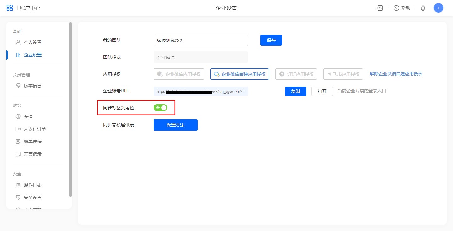 1、团队创建者账户登录系统,进入[账户中心]->[企业设置]->开启[同步标签到角色]开关。