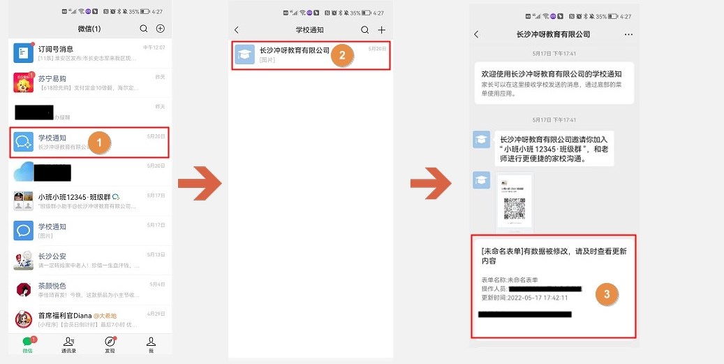 企业微信团队,内部通讯录成员在企业微信中进入系统和接收消息,家校通讯录中家长的消息在微信收到。如下图,家长收到数据修改消息。