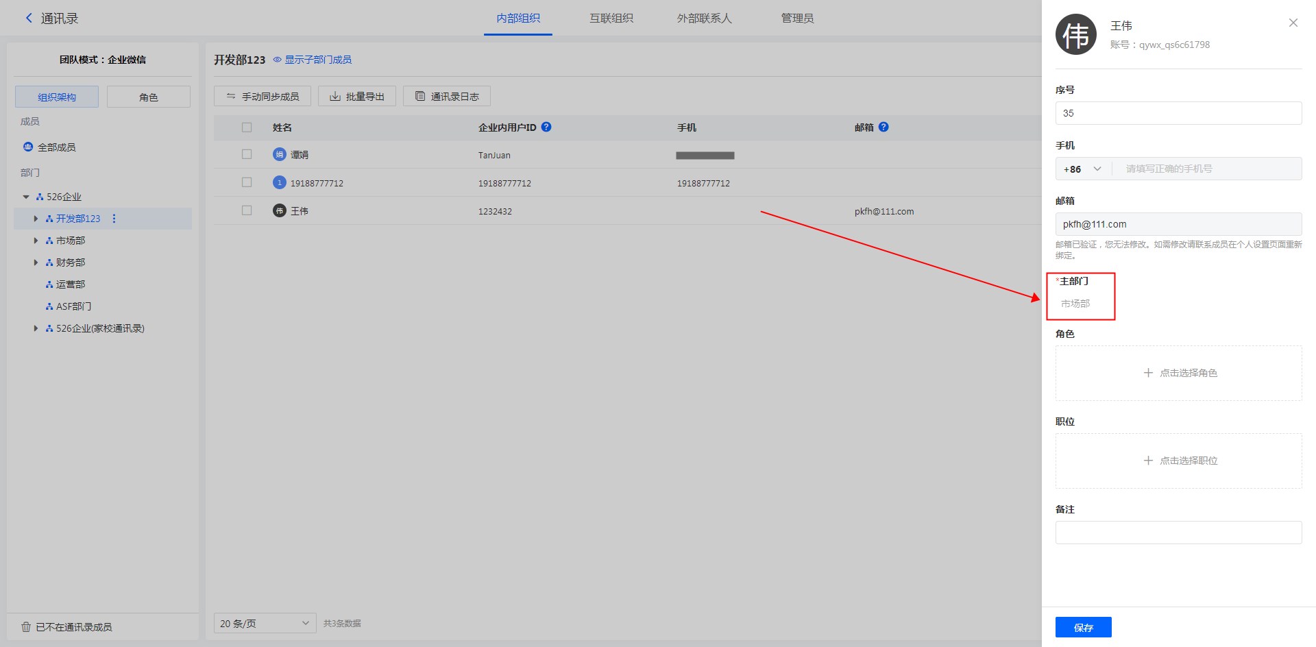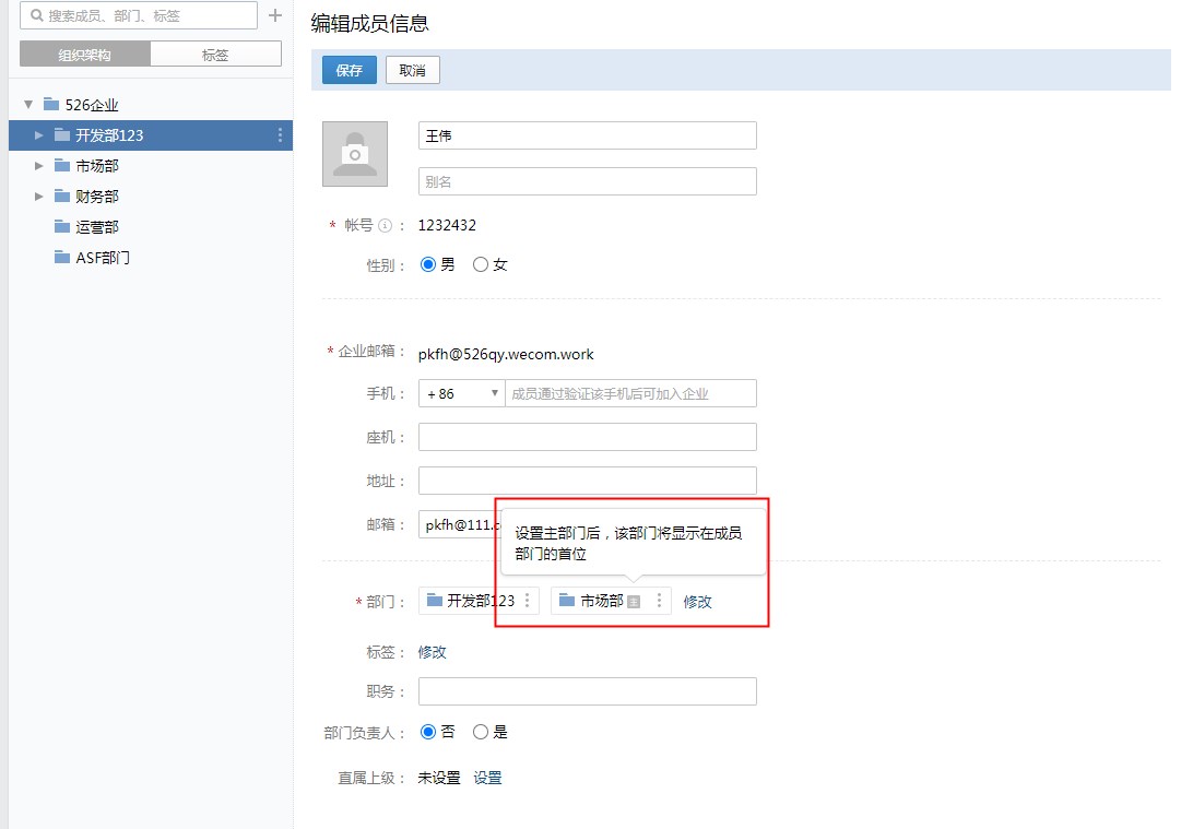 企业微信主部门 同步到平台通讯录后,成员主部门信息