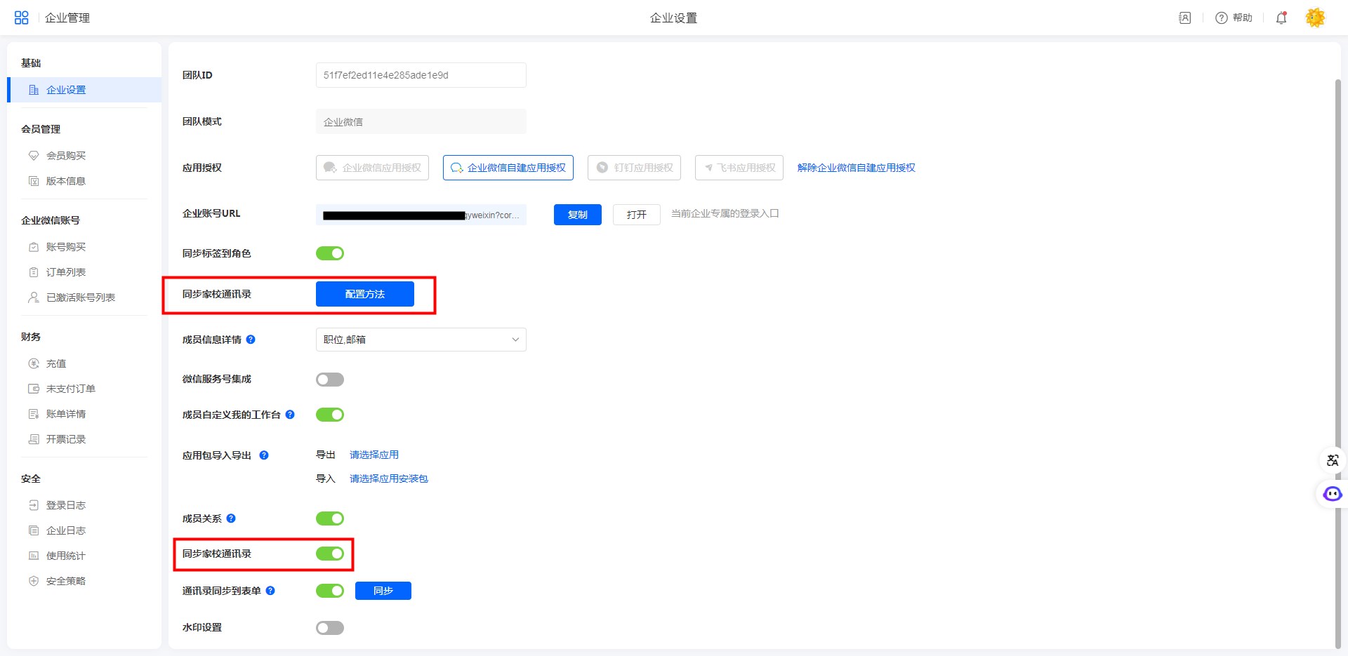 • 企业微信自建应用授权模式:创建者登录,进入系统[账户中心]->[企业设置]->[同步家校通讯录],根据页面指引完成配置,并开启家校通讯录同步开关。