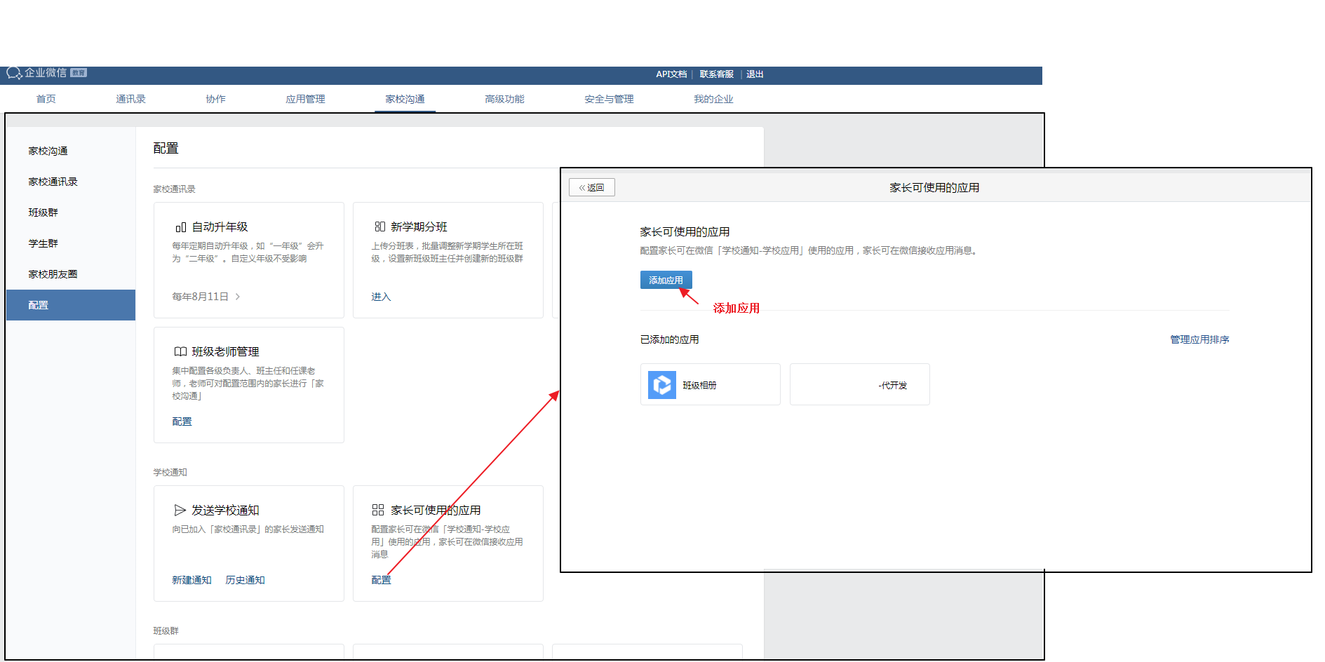 方法:企业微信管理后台->家校沟通->配置->家长可使用的应用下,配置并添加应用