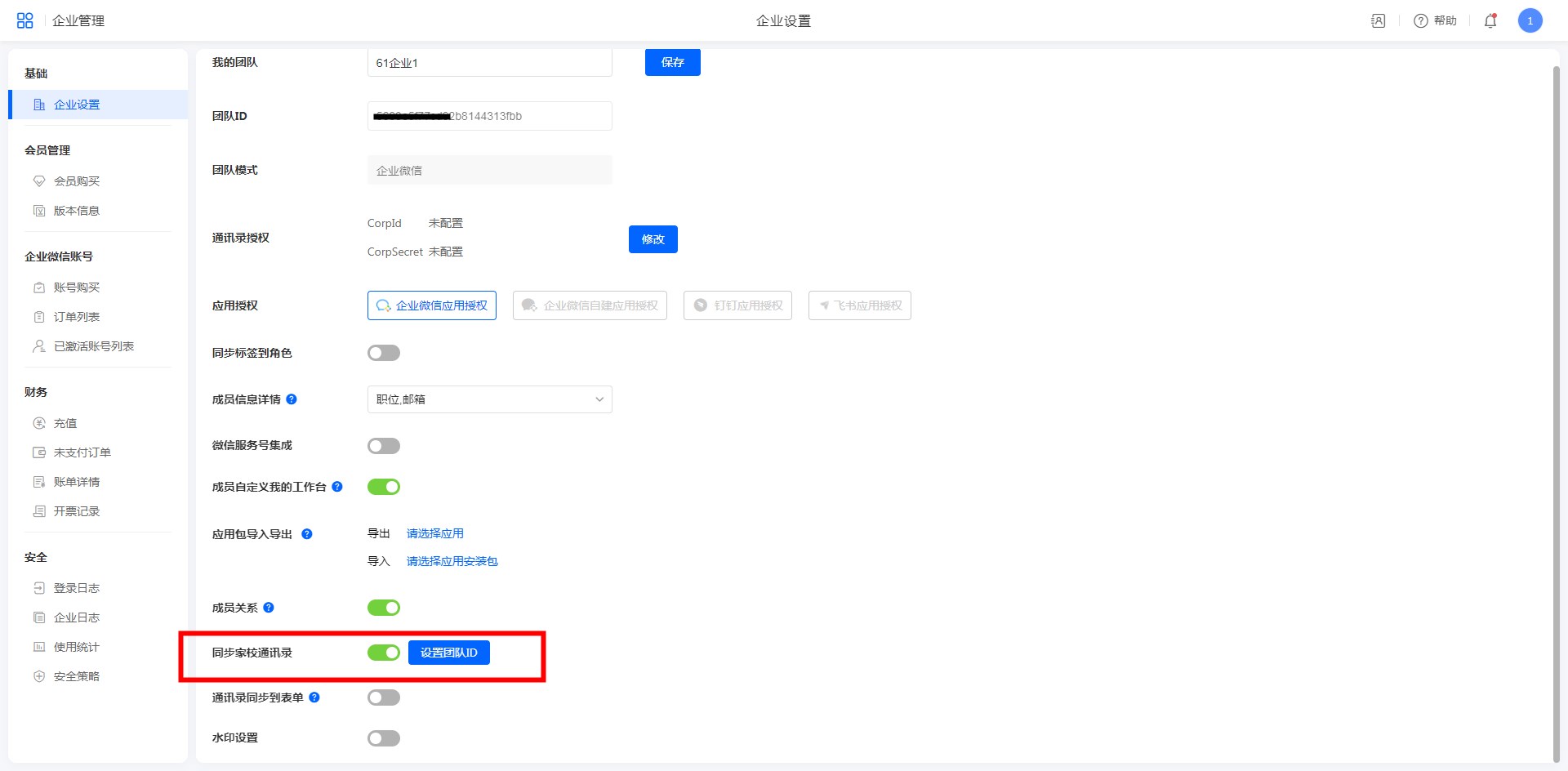 【设置团队ID】:此处设置企业微信团队企业ID;设置后,家长在微信中访问表单,图片定位等控件才能正常使用。