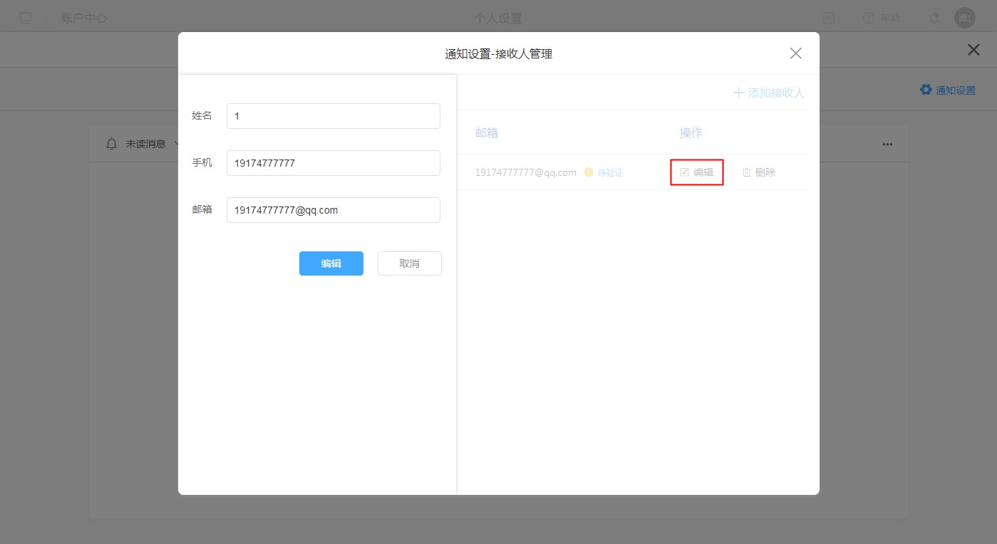 【消息中心】-【通知设置】-【消息接收人管理】,可以看到已经添加的消息接收人,也可以添加新的消息接收人。