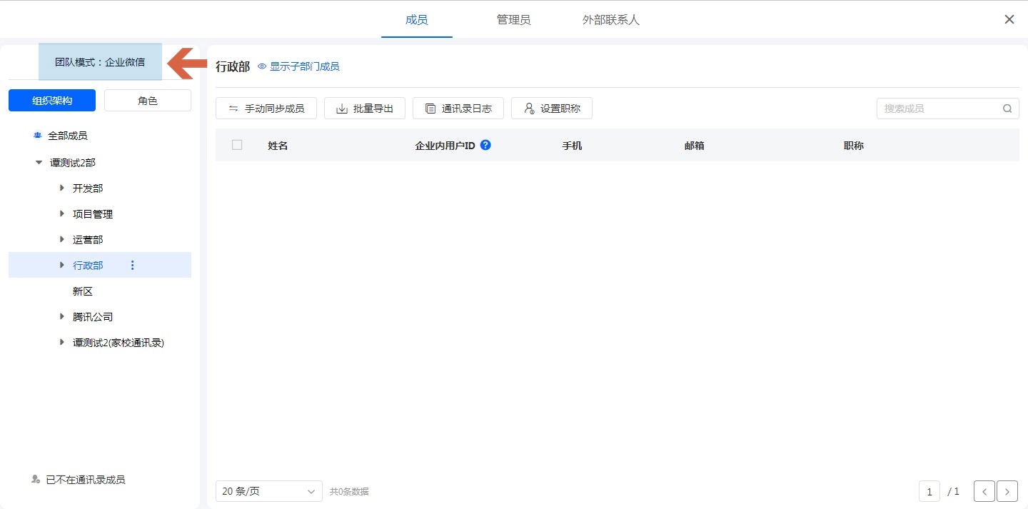 如果是闪搭账号的形式的团队则是普通模式,如果是企业微信/钉钉模式/飞书模式的团队,则需要在企业微信/钉钉/飞书管理后台同步组织架构。