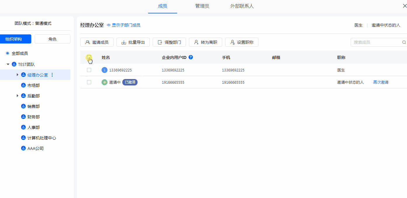 如需对员工进行批量调整部门,可通过在通讯录中选择需移动的成员,进行批量移动。