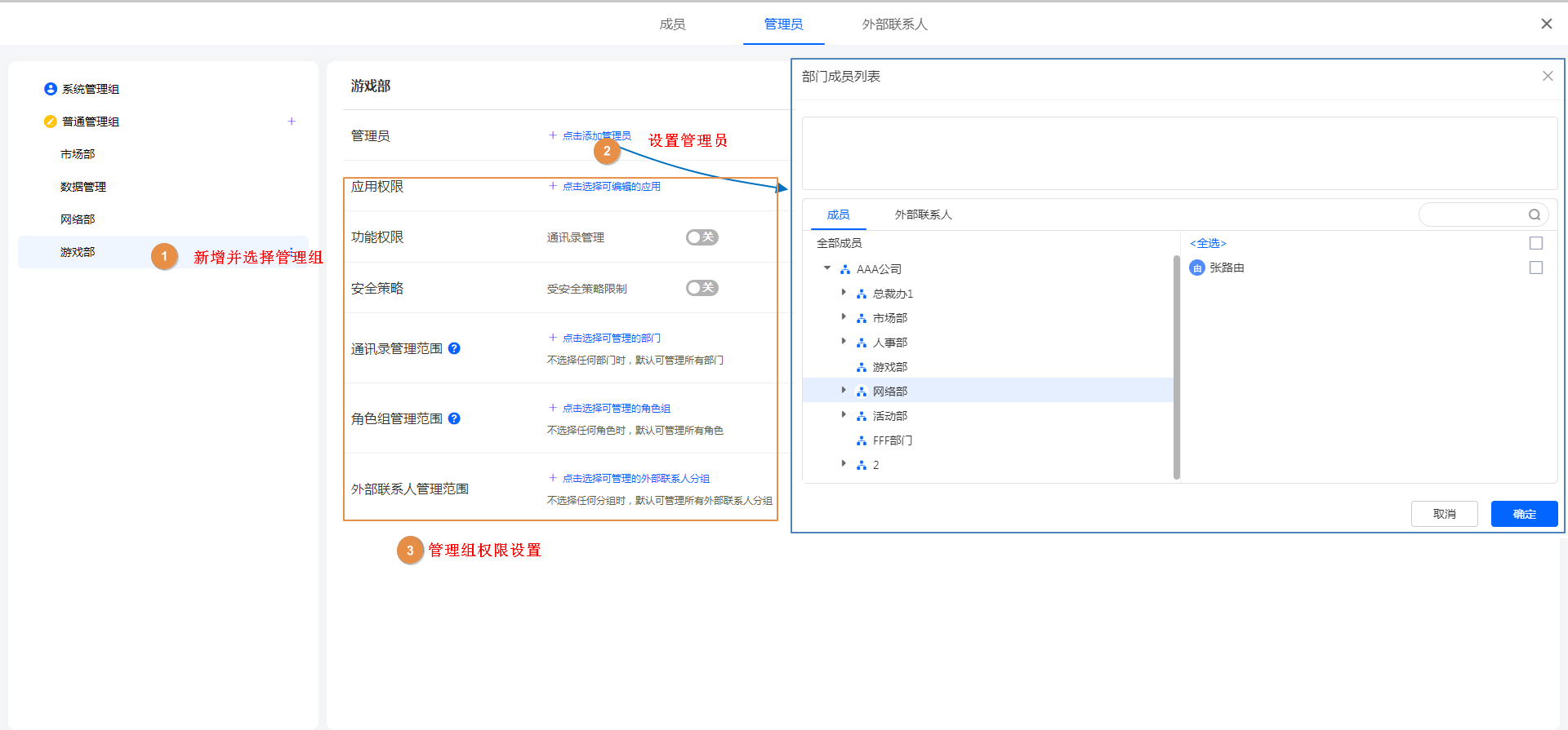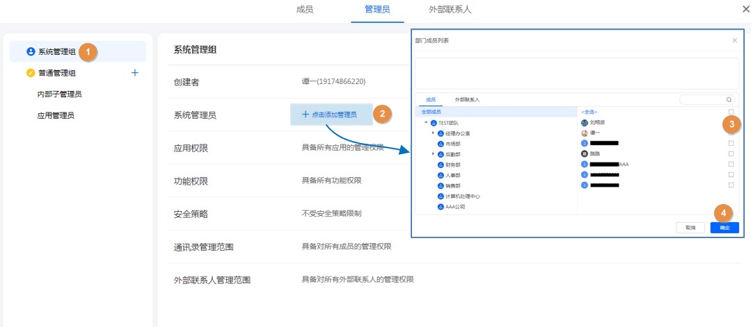 注意:系统管理员只能设置内部成员,外部联系人不能设置为系统管理员。