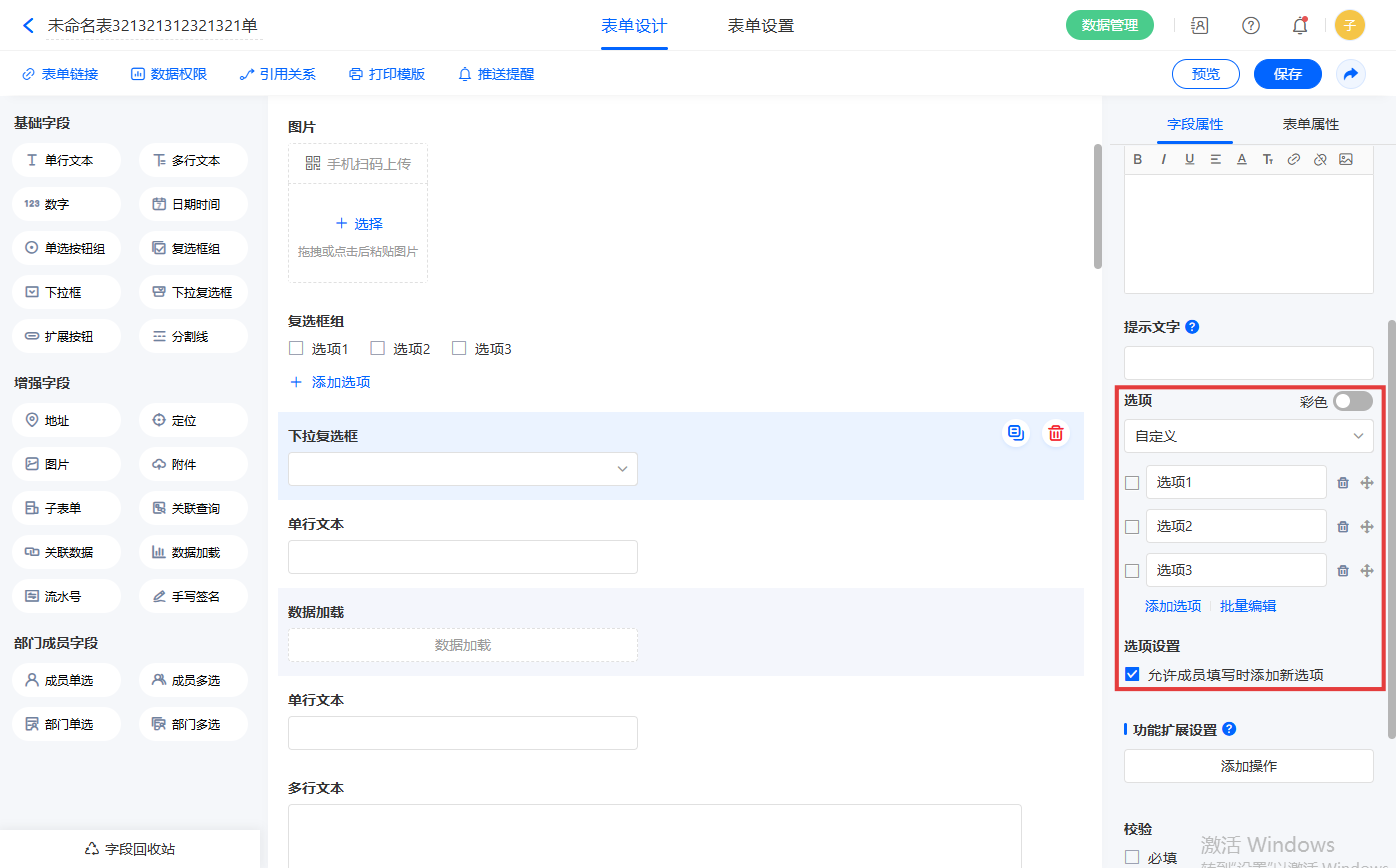 勾选允许成员填写时,添加新选项成员增加自定义选项