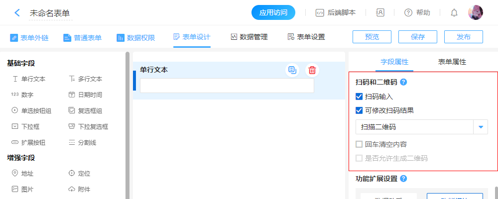 勾选扫码输入后,在填写表单时可以扫码读取到条形码或者二维码中包含的信息,并显示在单行文本中。