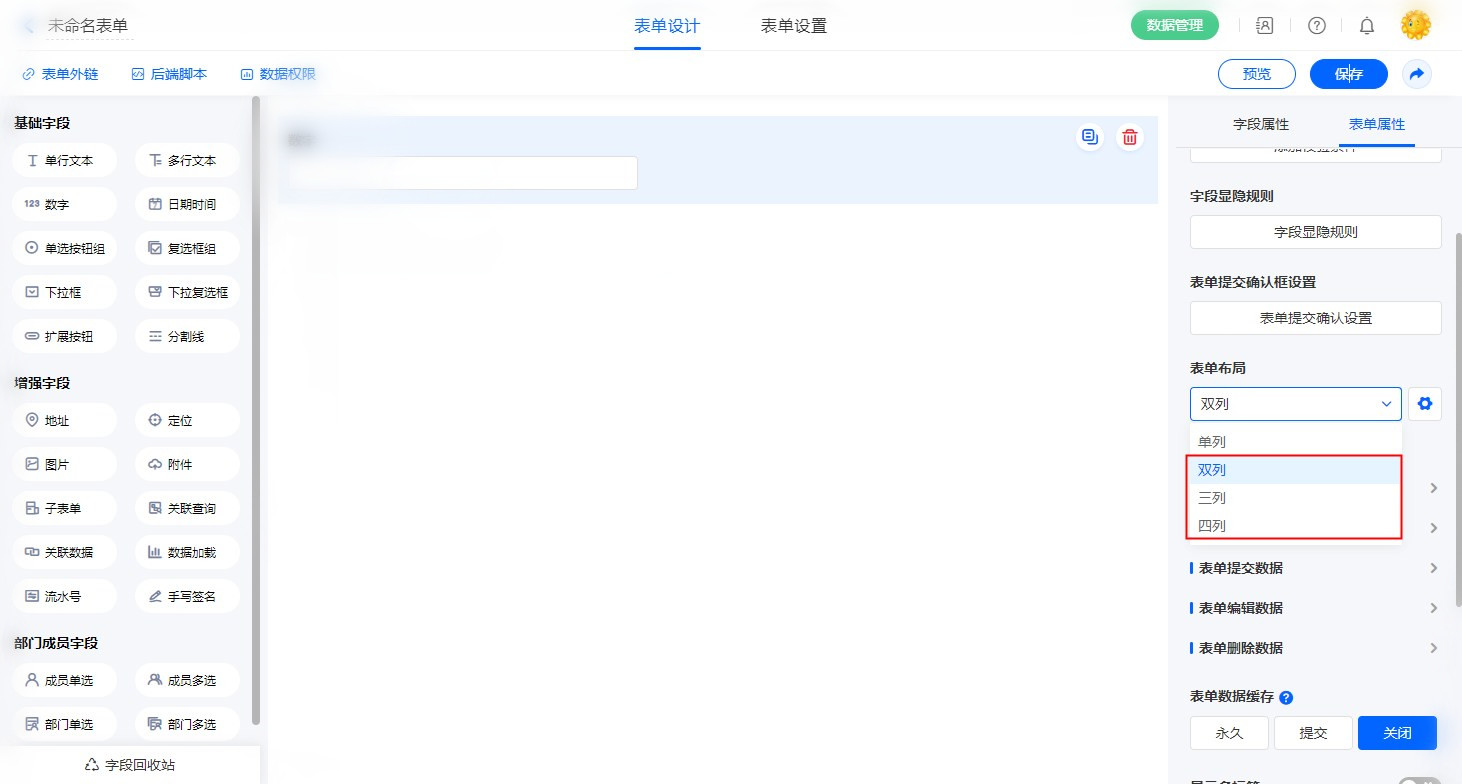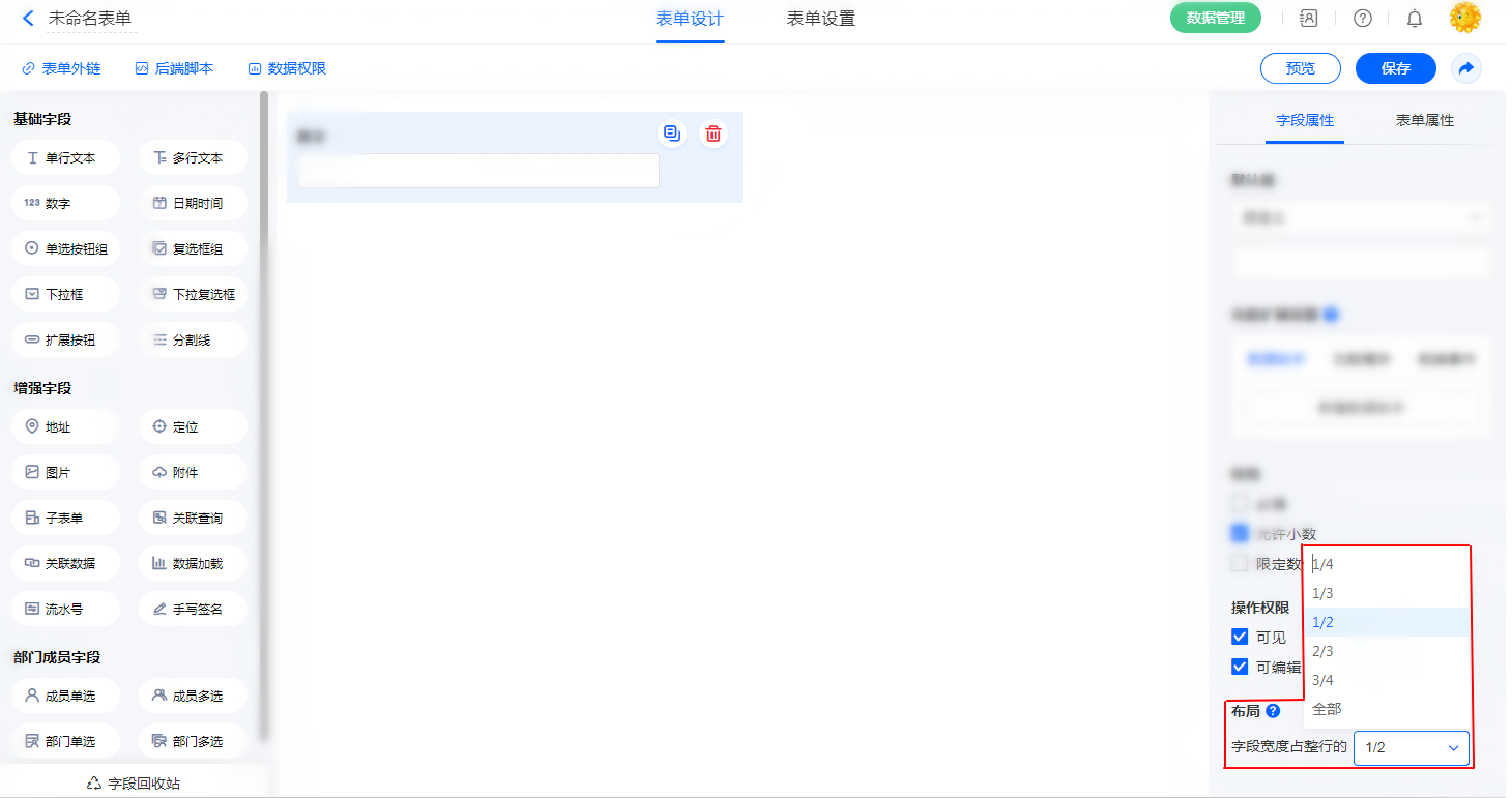 默认字段占整行,在开启多列布局时也可设置占据一整行。
