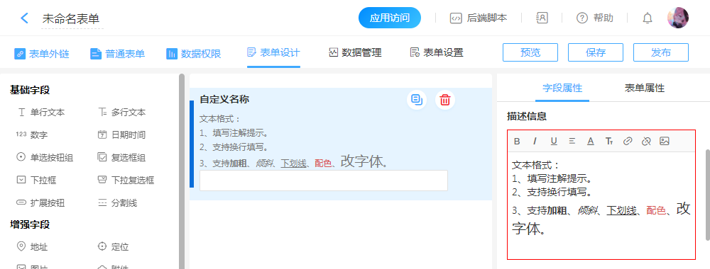 | 公式编辑 | 即单行文本的值是由公式来自动计算出的。 |