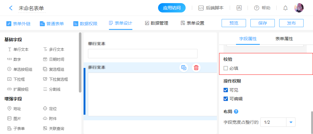 | 必填 | 勾选启用,填写表单时控件为必填项,为空则无法提交成功。 |