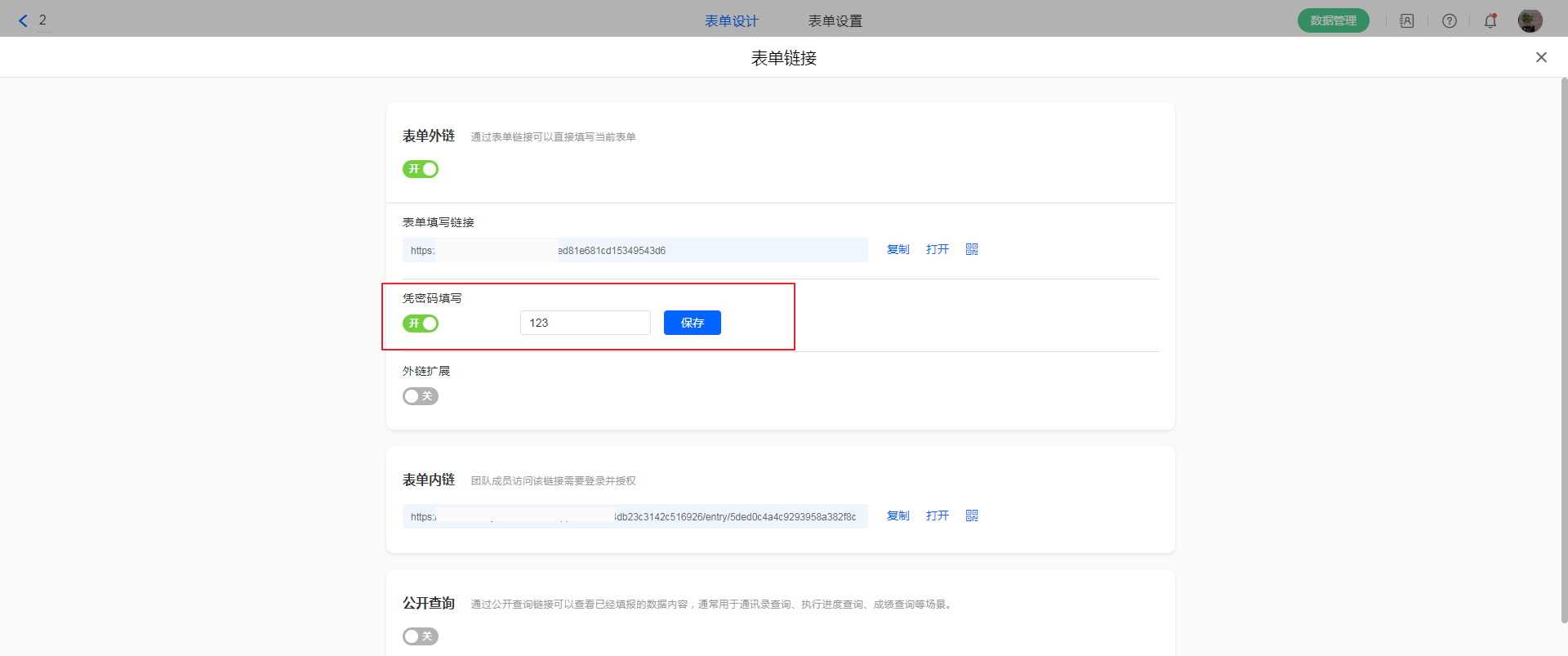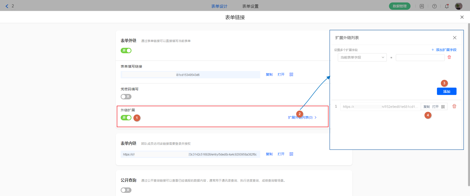 即可开启当前表单的外链功能,开启后,可以将链接或二维码发送给对应的人员。