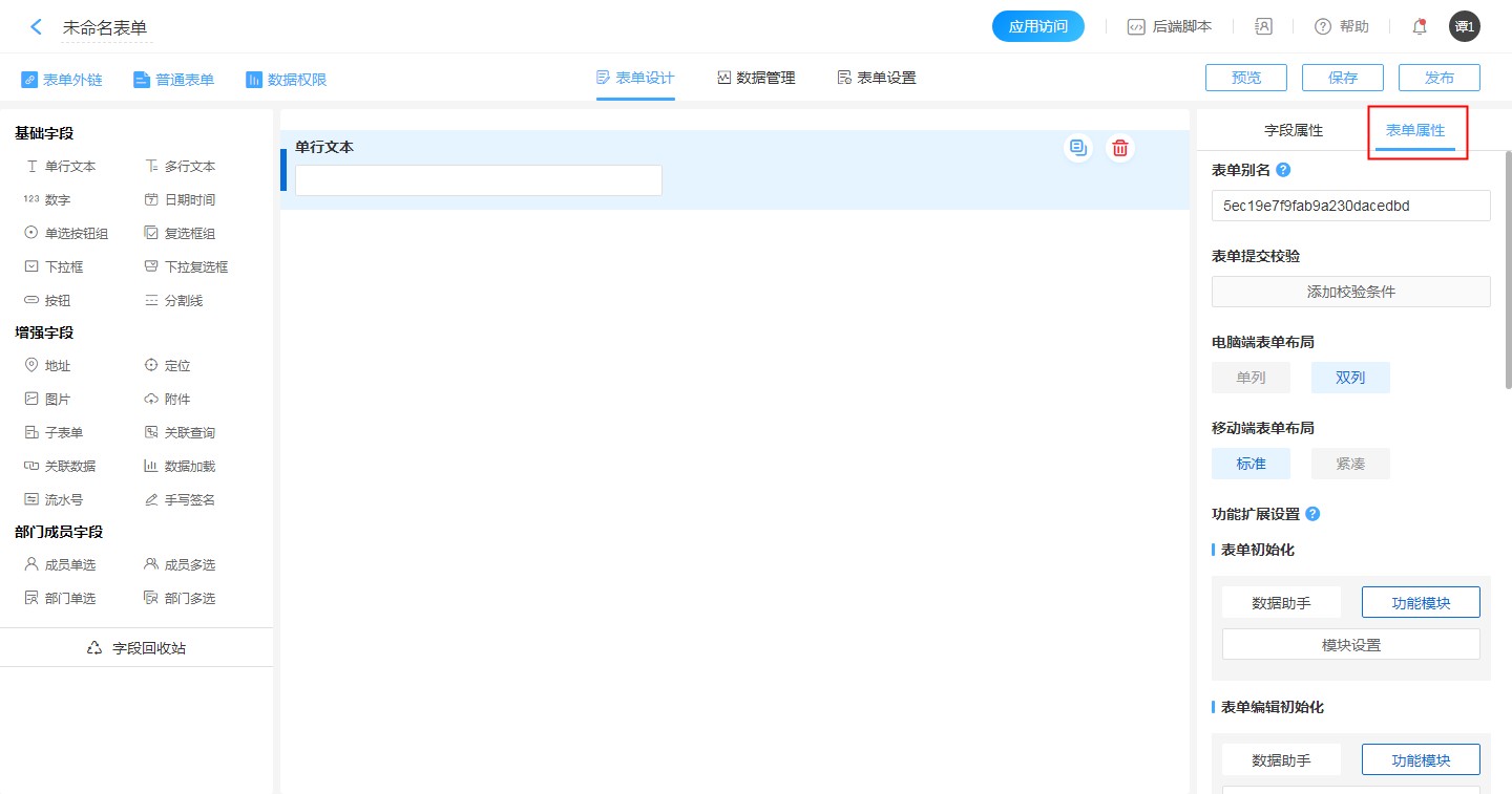 表单属性是对表单整体进行的一系列设置,区别于字段属性对于单个字段的设置。