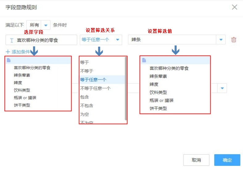 - 所有:所有条件必须同时满足才能显示后续字段。