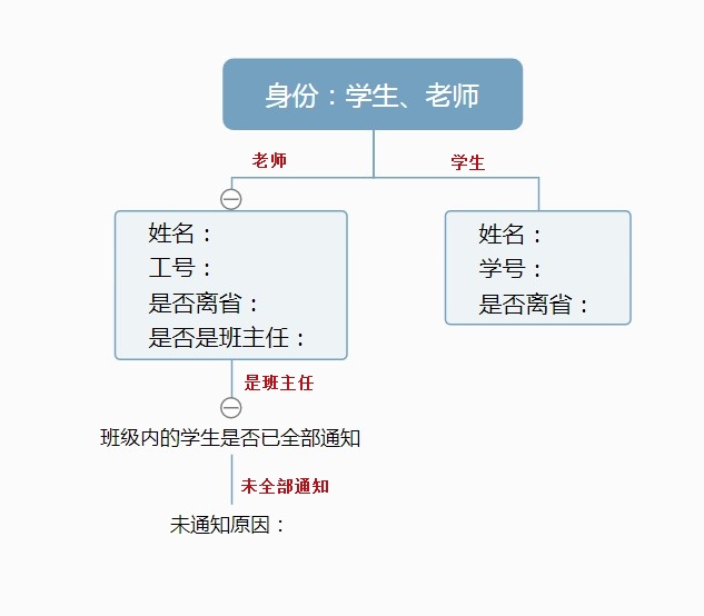 - 如学校假期期间行程调查的表单中,学生身份填写:【姓名】、【学号】、【是否离省】等字段;老师身份填写:【姓名】、【工号】、【是否离省】、【是否是班主任】等字段,当是班主任时,还需要填写【班级内的学生是否已全部通知】,如果未全部通知,还需要填写【未通知原因】。