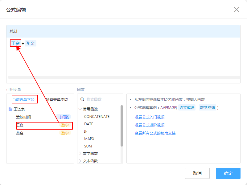 - 注意: 所有的控件,都有一个内置的ID,而所能看见的控件名称,也仅仅是一个名称,所以当公式需要将控件值作为变量的时候,手动输入或复制粘贴都是无效的,因为字段名可以重复。如果需要将这个字段(控件)引入计算,需要手动点击左侧的字段列表。