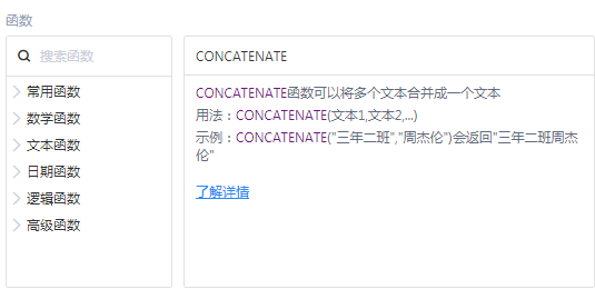 公式编辑面板下方可以选择所需公式。函数可以自己编写也可以在下方选择使用,选择的函数右侧会出现函数的用法。