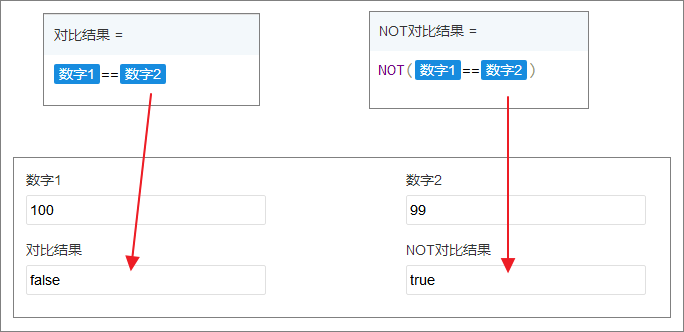 | NOT(数字1==数字2) | true | 反向(数字1等于数字2):成立 |