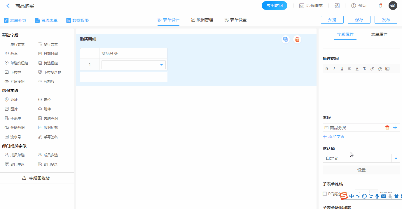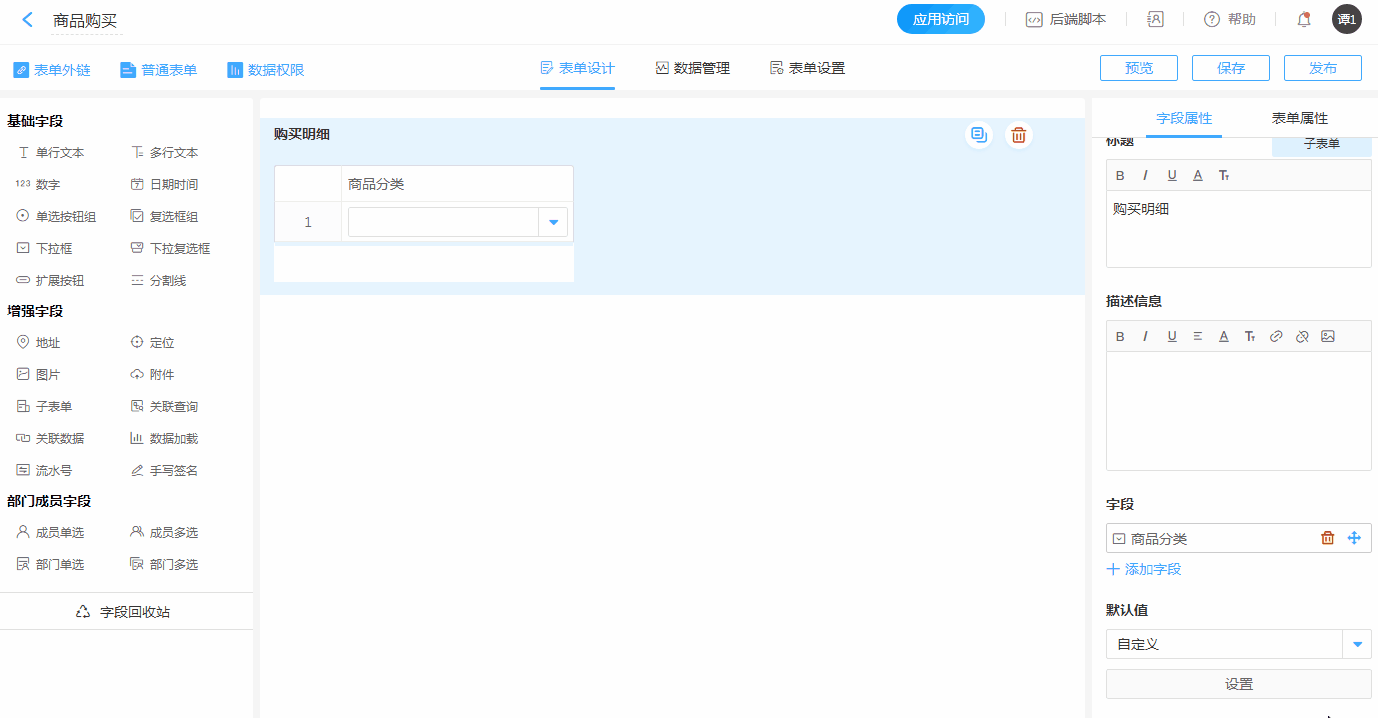2、【子表单】控件属性“字段”添加1个【下拉框】字段,标题为:商品分类,数据关联到表单【商品信息】里的"商品分类"。