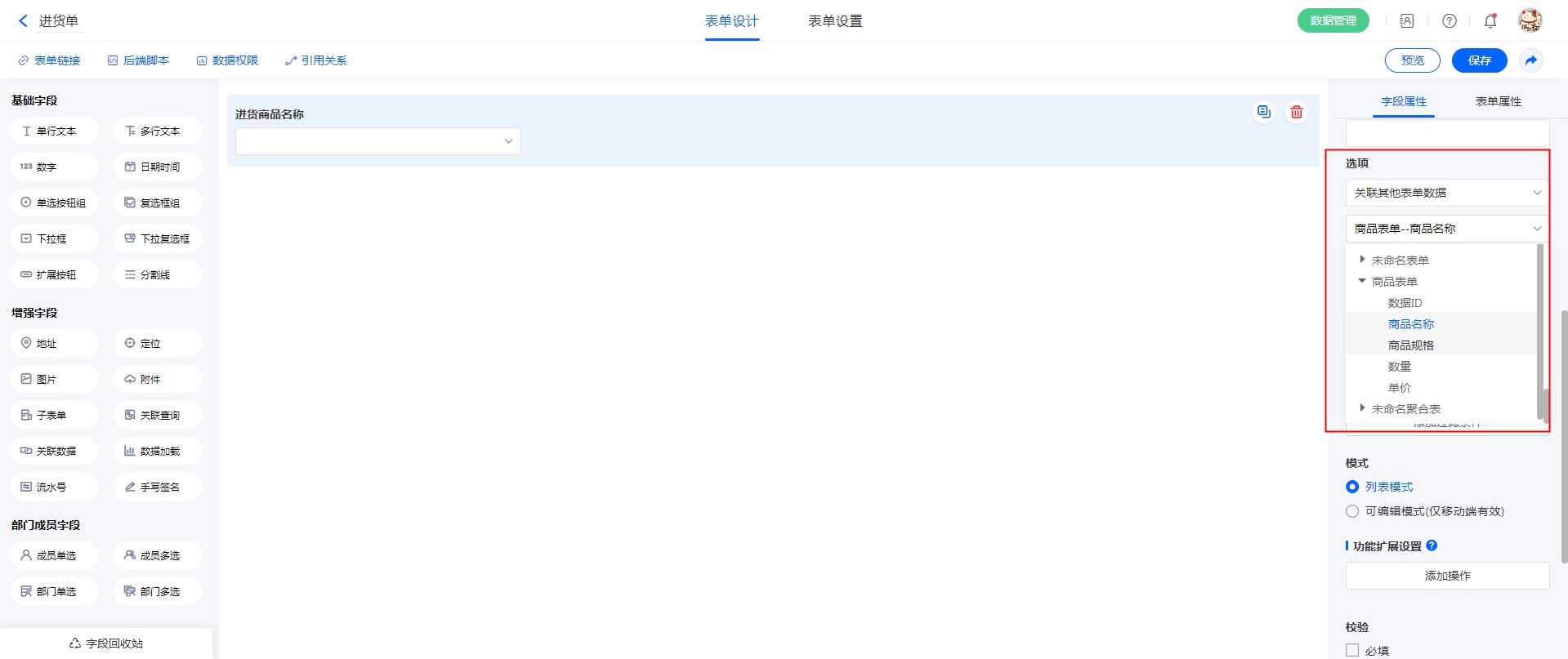 【创建一个[下拉框]标题名称叫“进货商品名称”】——【控件属性】——【选项】——【关联其他表单数据】——【商品表单-商品名称】