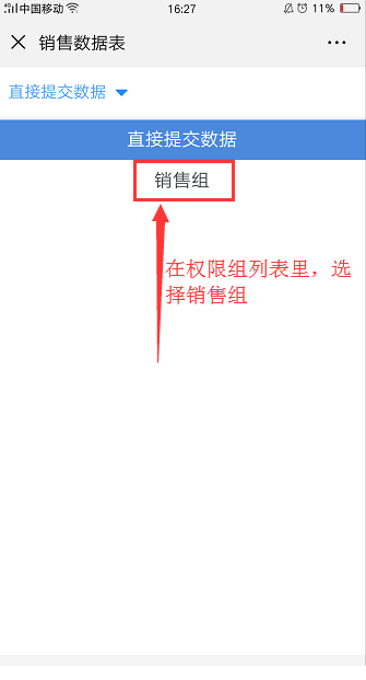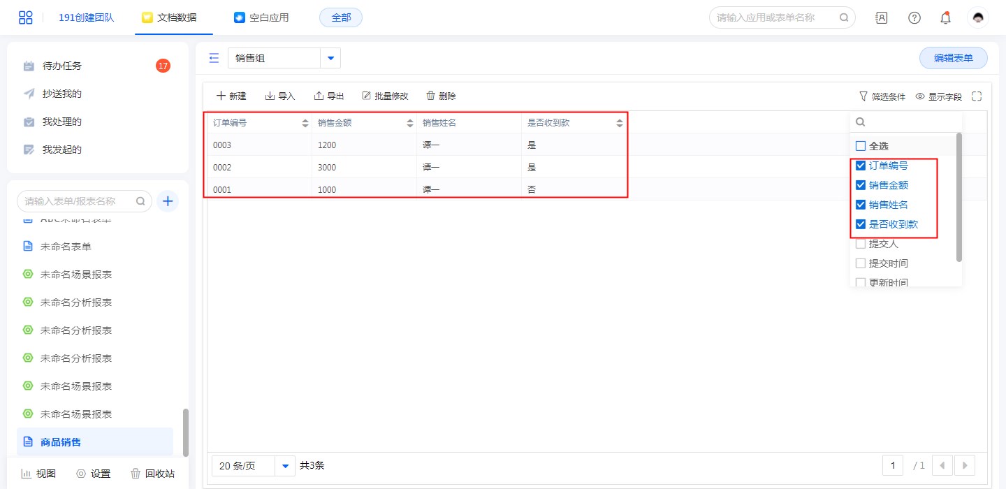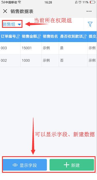 在【销售组】的数据列表里,可以查看数据、显示所需字段、新建数据。