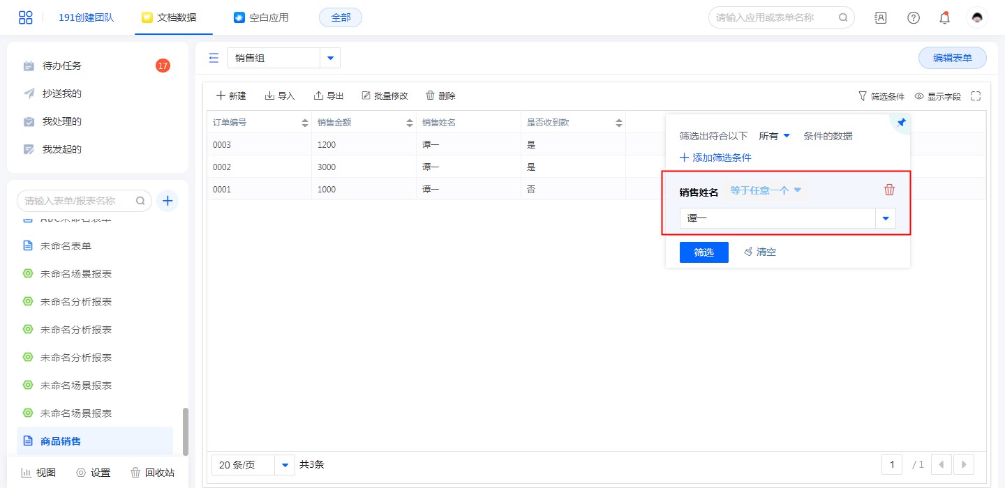 - 筛选条件可以自行设置,从该权限组内的可见字段中选取。