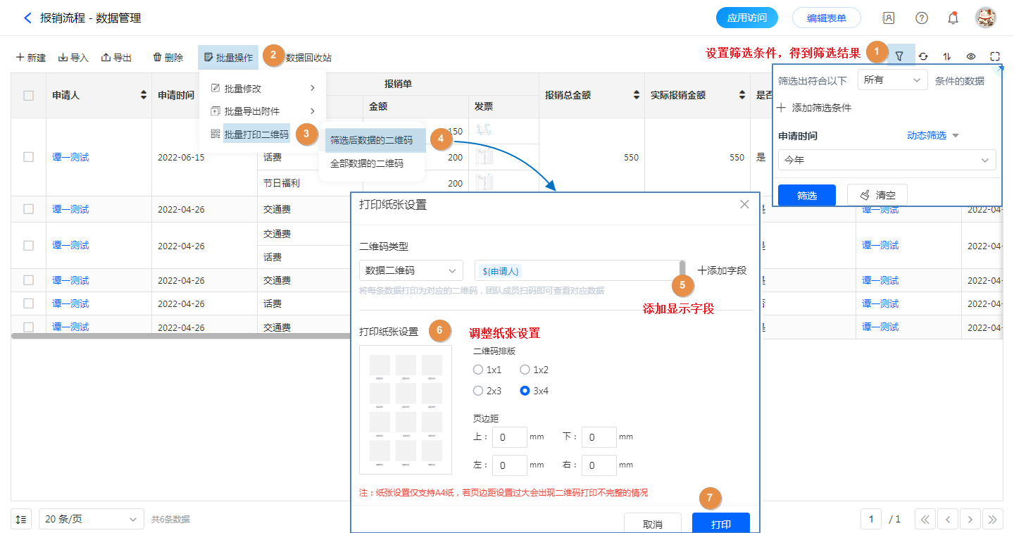 - 打印筛选后的数据:管理员登录,【表单访问】——【数据管理】,设置筛选条件得到筛选结果,【批量操作】——【批量打印二维码】——【打印筛选后的数据】——【打印纸张设置】——【打印】