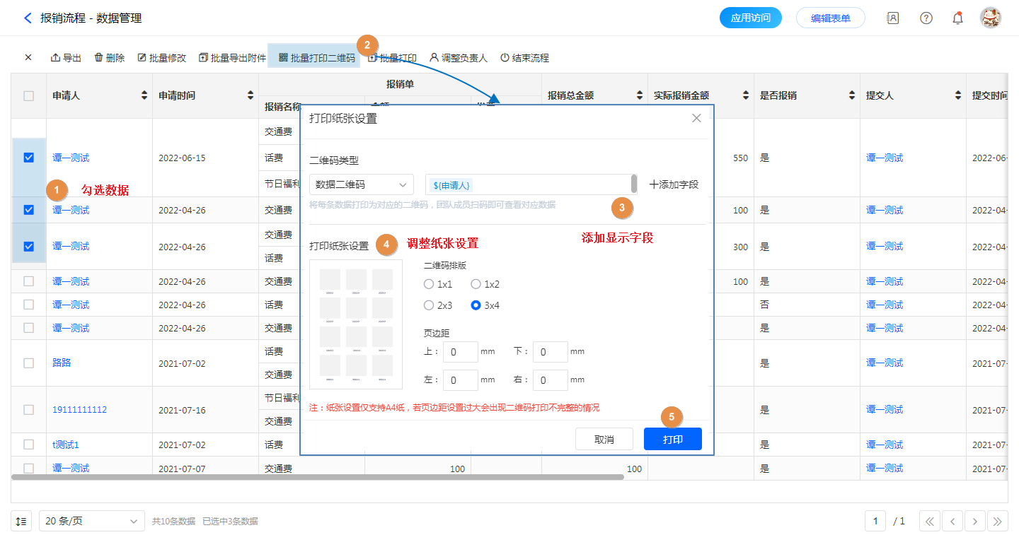 - 打印勾选数据:管理员登录,【表单访问】——【数据管理】,勾选需要打印的数据,——【批量打印二维码】——【打印纸张设置】——【打印】