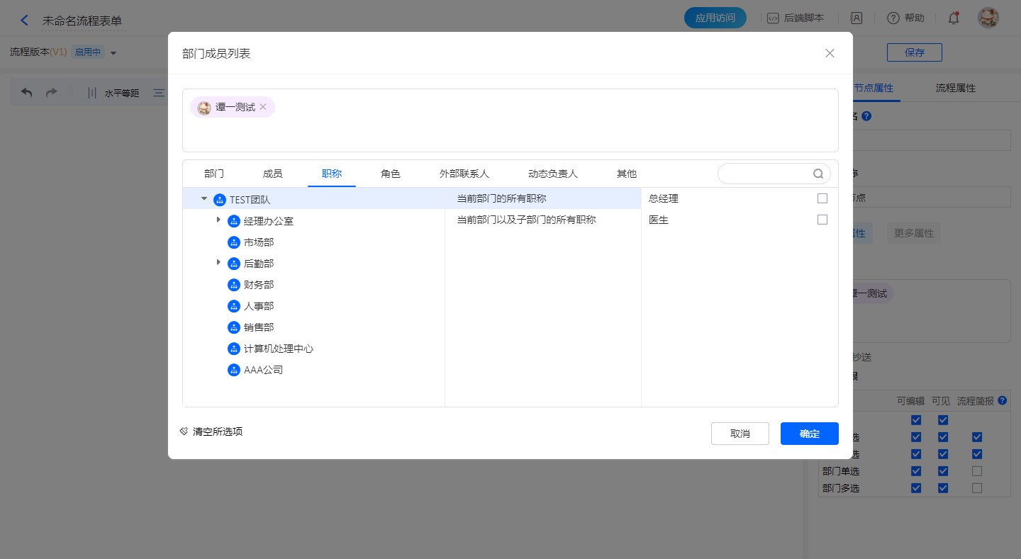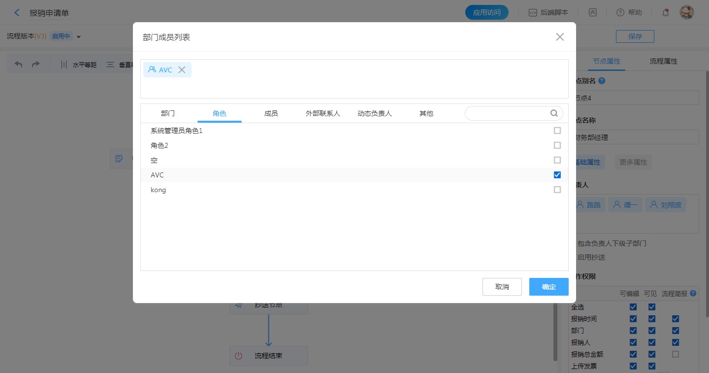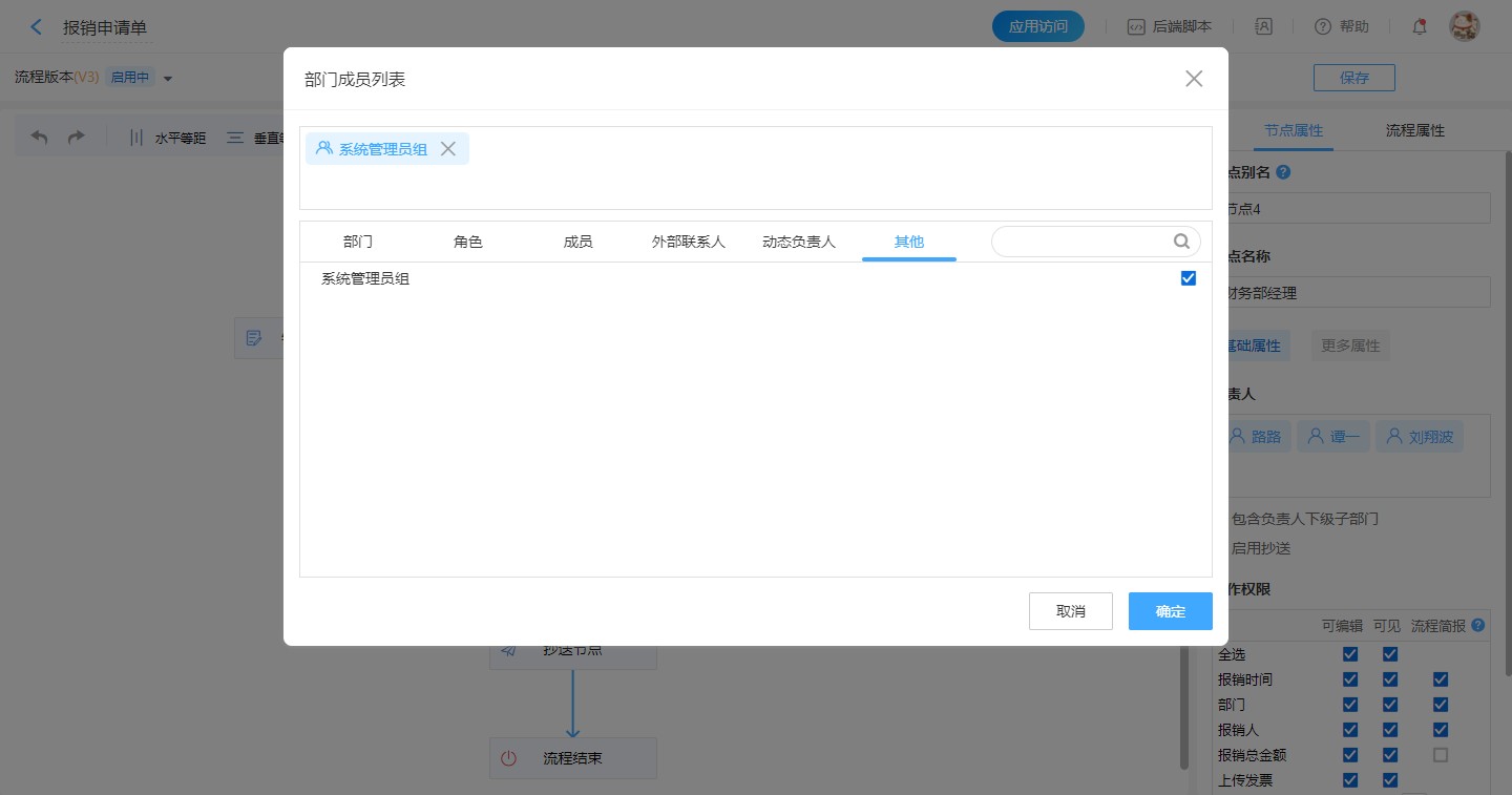 节点负责人可设置多个,勾选对应的部门、角色、成员等即可。