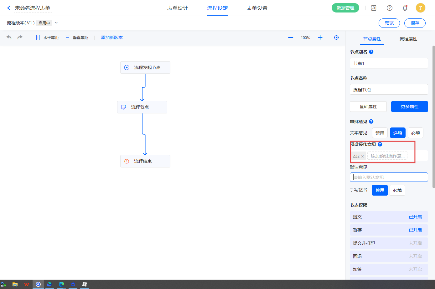 【流程设定】——【点击某一节点】——【节点属性】——【更多属性】——【审批意见】