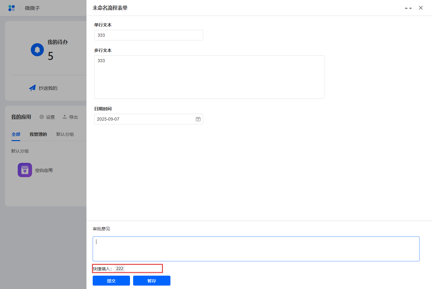 处理待办数据时,会有系统自带的审批意见填写框,不强制要求填写。可选择填写预设操作意见或者默认意见。