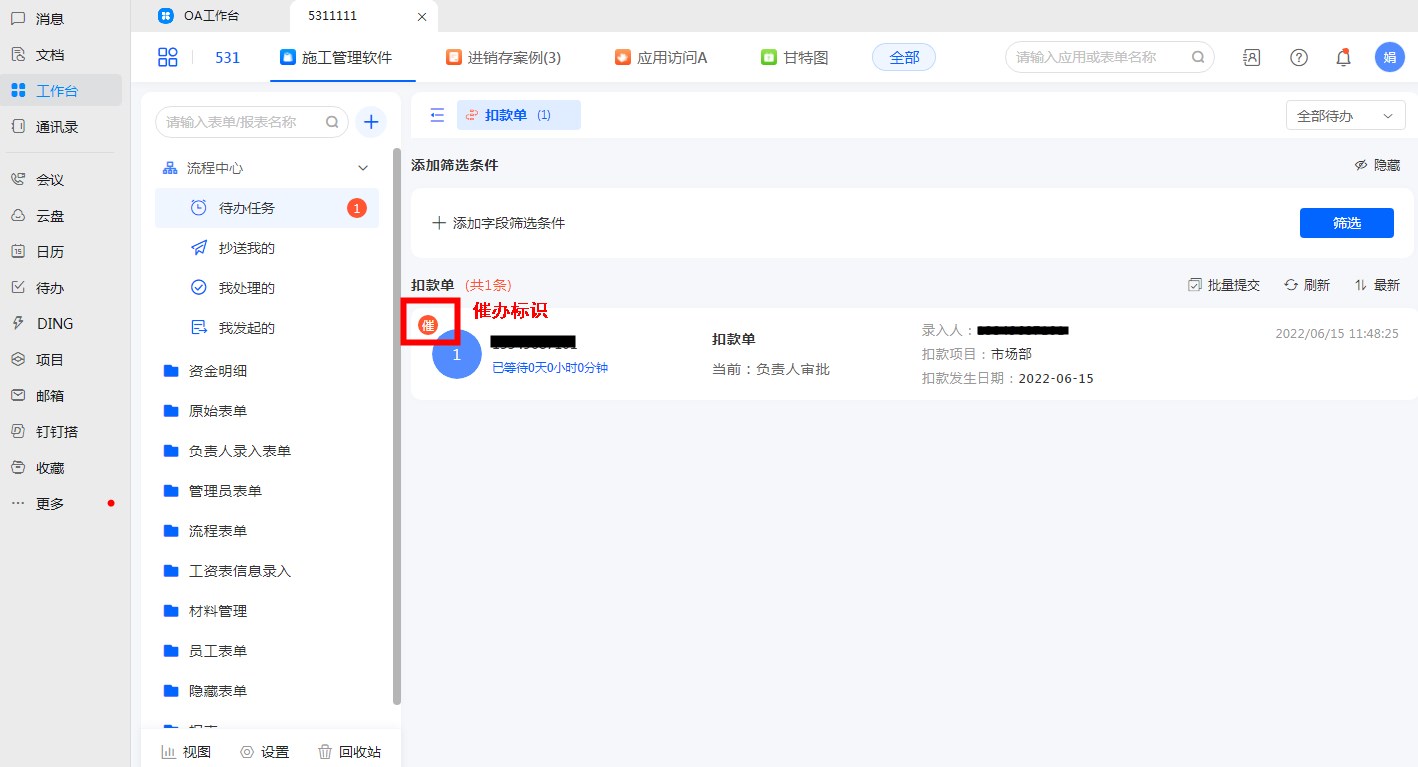 流程节点负责人收到催办消息,并在我的待办下,发现流程有催办标识。