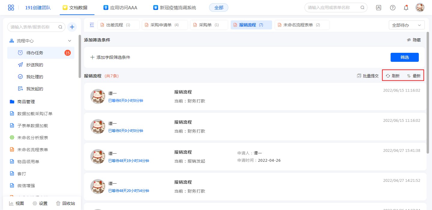 在【待办任务】、【抄送我的】、【我处理的】、【我发起的】均可刷新流程数据。