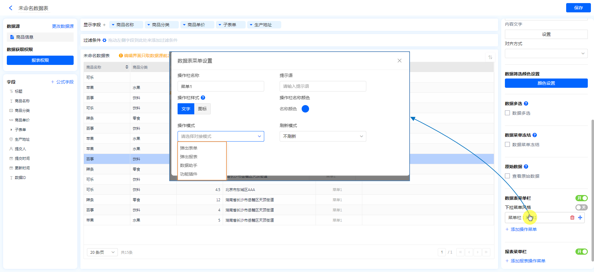 数据表菜单 支持 弹出表单、弹出报表、数据助手、功能插件