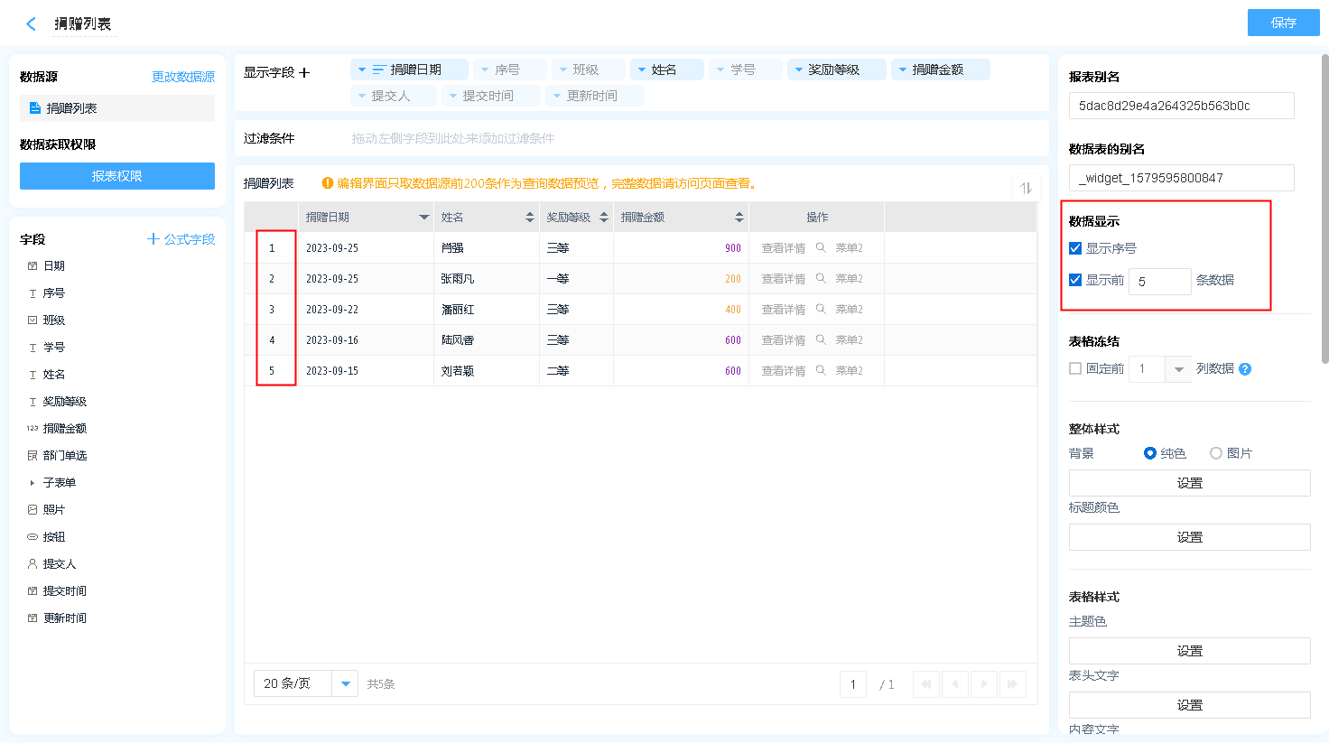 可以设置当前数据表是否显示序号以及限制显示数据条数。