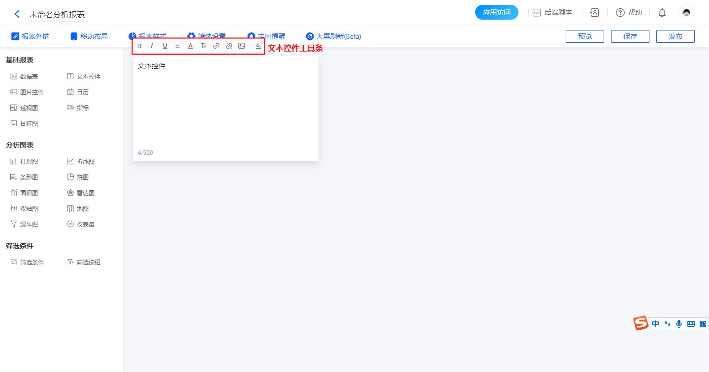 文本控件可以被拖动到报表的任意位置,用来对报表数据分析的描述说明。当领导在查看某个分析图表时,加以文本说明,可以使数据分析更易理解。