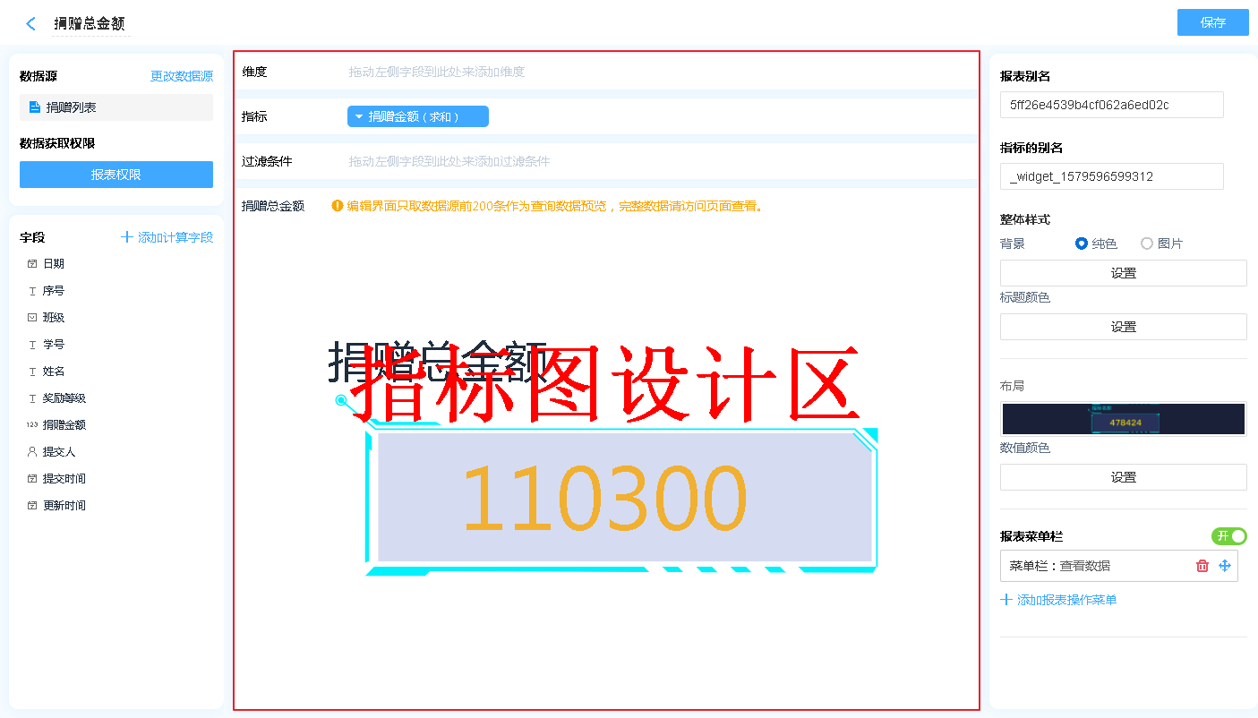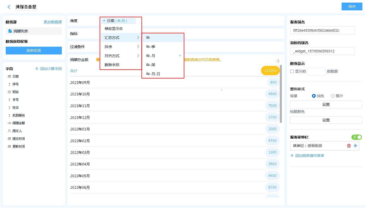显示名称: 字段添加进入显示字段区域后,可自行修改其在指标中的表头文字汇总方式: 仅日期时间字段可设置,可以设置按照何种日期格式对数据进行汇总(如:按年、按季度、按月汇总)排序:支持按照指定的格式对指标内的数据进行排序[默认为数据创建时间]对齐方式:支持报表的排列方式删除字段:此处的删除字段,是指从显示字段中删除,删除后仍可重新添加,不会对原表造成任何影响。
