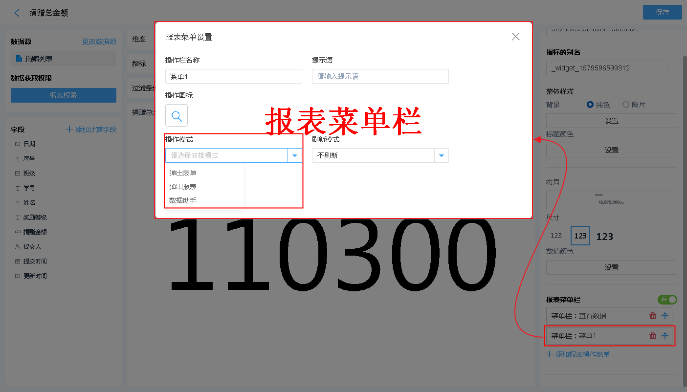 报表菜单 支持 弹出表单、弹出报表、数据助手