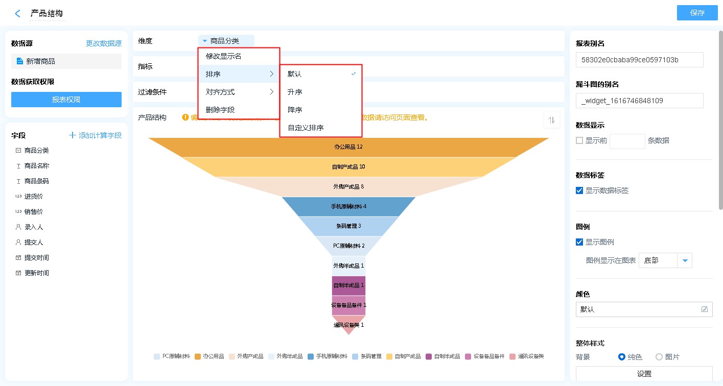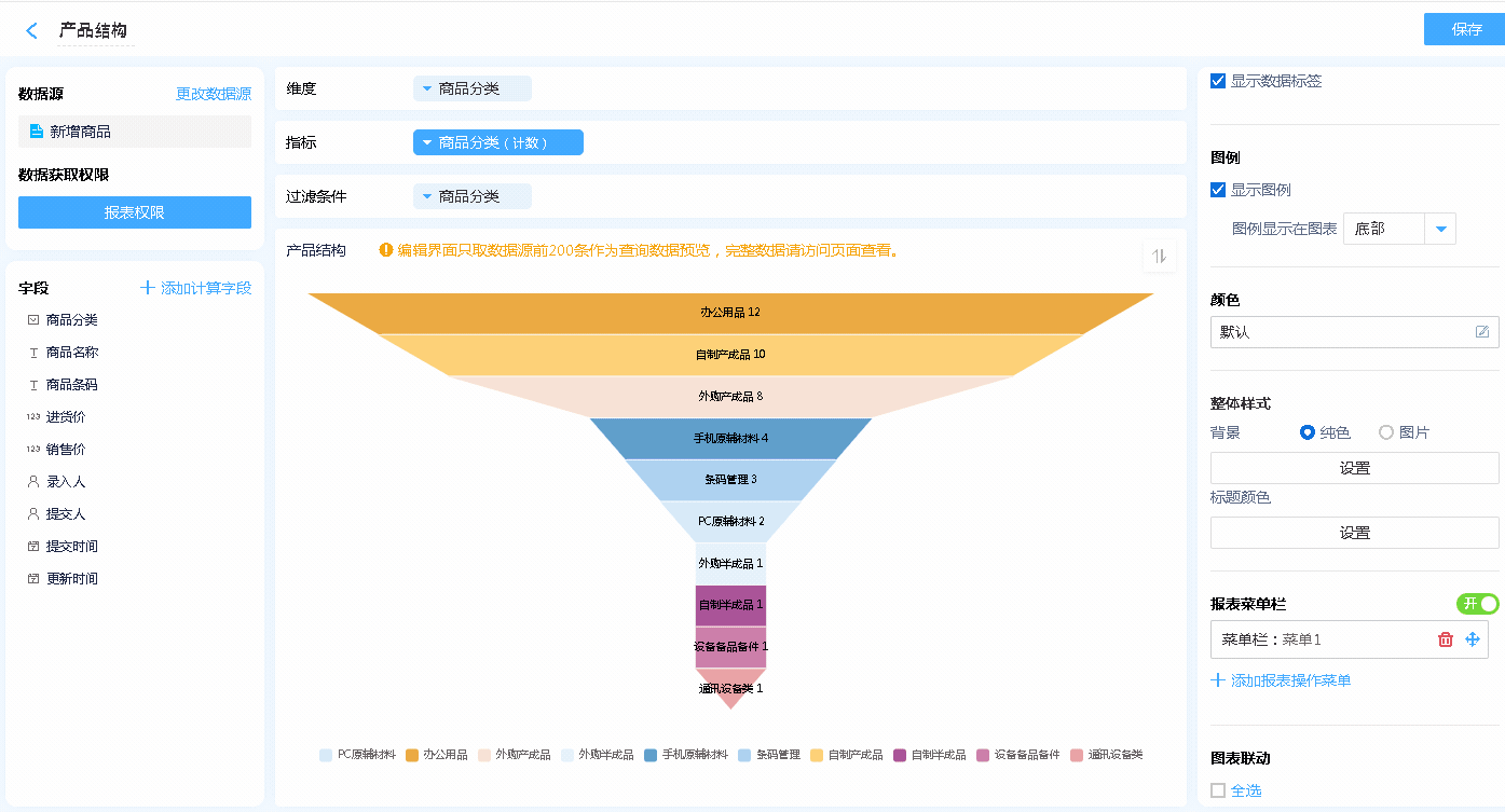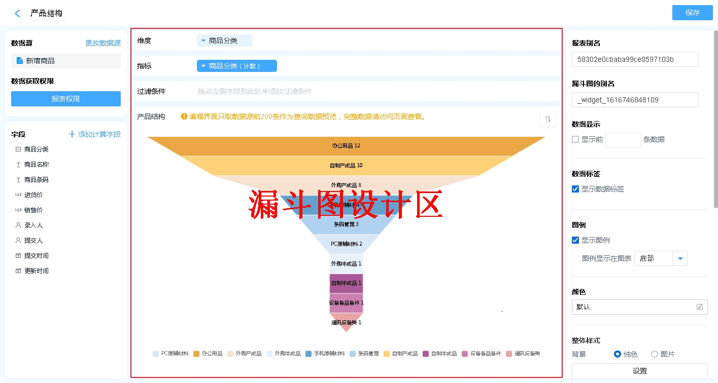漏斗图适合有先后顺序的数据,由大到小,逐级减少的场景,如:客户转化率、产品结构等,如:进销存系统中,商品分析报表中就利用漏斗图实现的产品结构图,方便管理者了解当前产品结构。