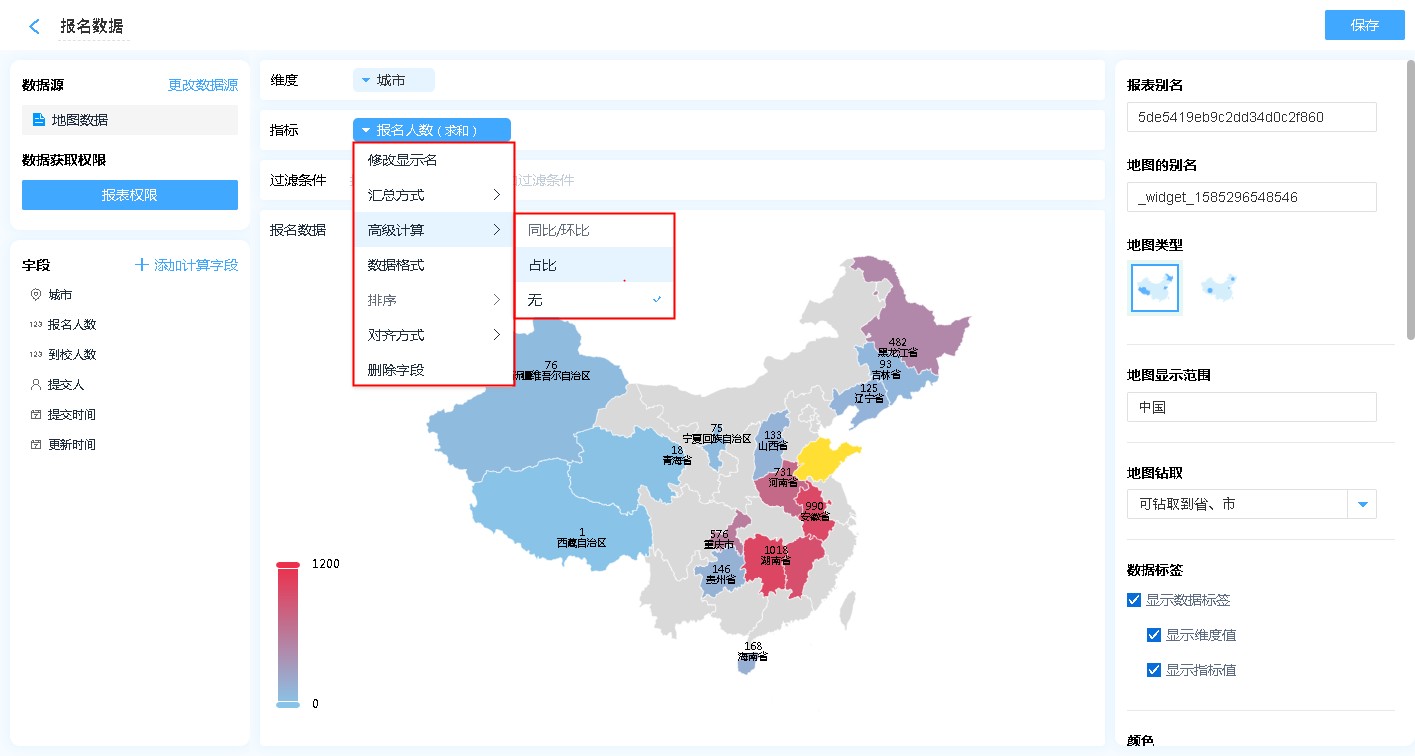 - 显示维度值:在地图上对应的区域显示维度的内容,一般情况下是省/市/县区信息。