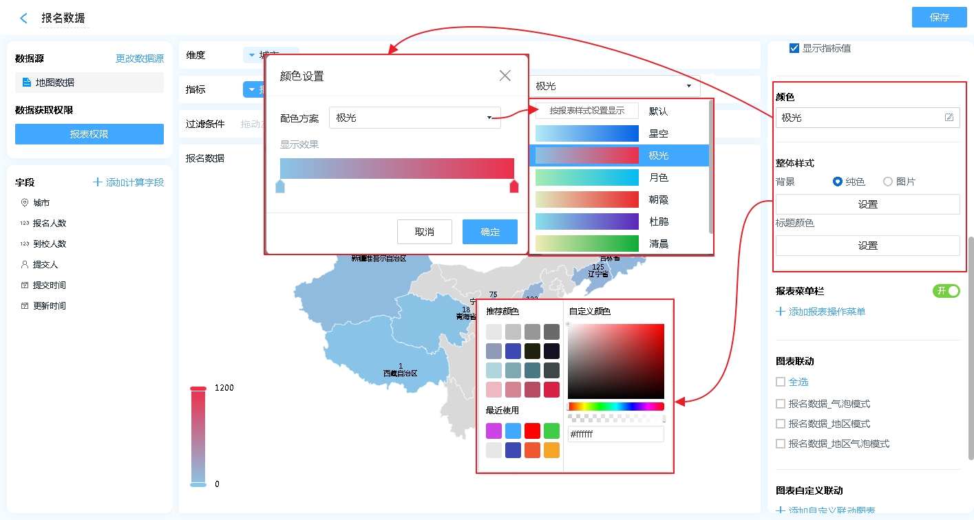 地图报表的整体颜色风格,系统默认内置有7种配色方案,还可自行配置。