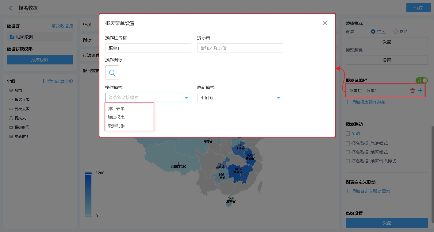 报表菜单 支持 弹出表单、弹出报表、数据助手