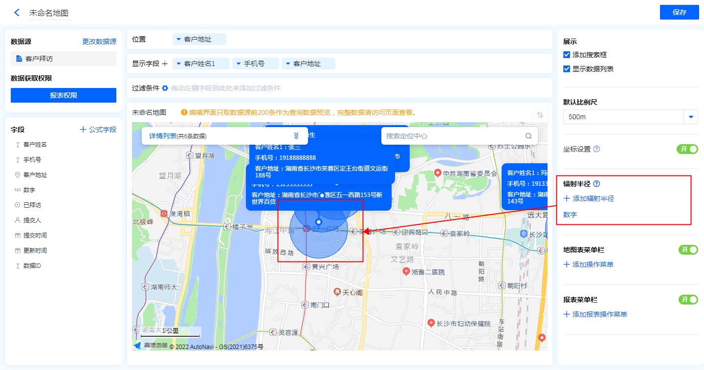 用于地图上位置字段的有效范围的半径设置,以位置字段为中心,设置的字段值为半径的圆圈范围显示。