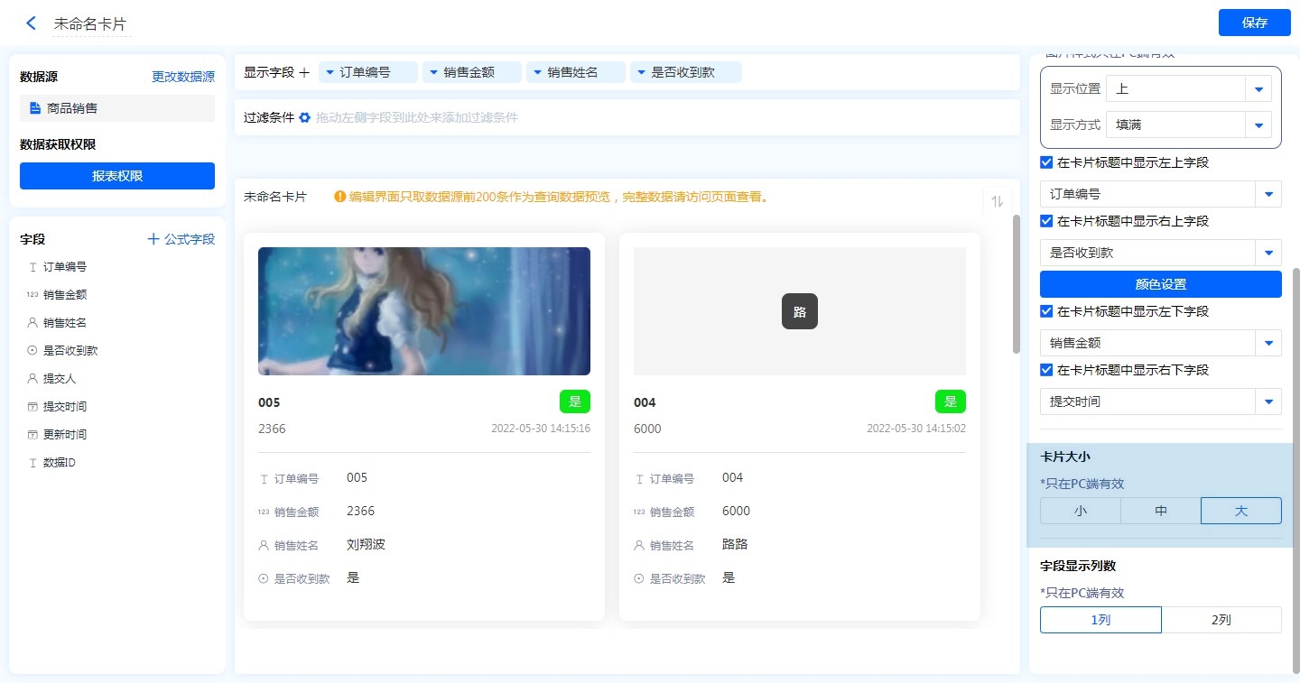 当卡片大小设置中/大时,可以设置字段显示列数。