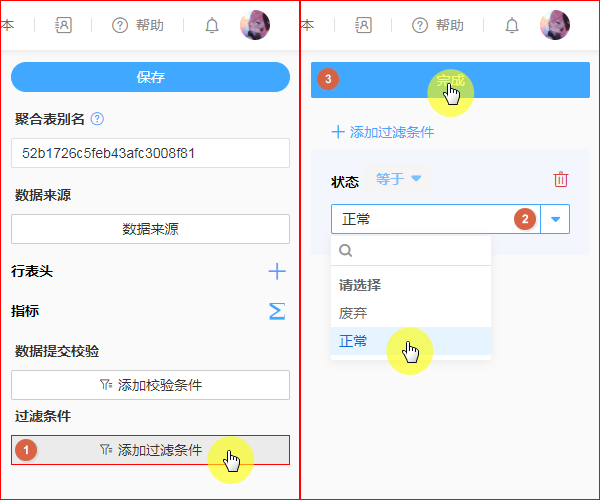 关联表单数据变更时,会触发聚合表计算“指标”所配公式,最终结果如无法符合“校验条件”,则拦截本次数据变更操作,并浮窗提示以上所配提示文字。
