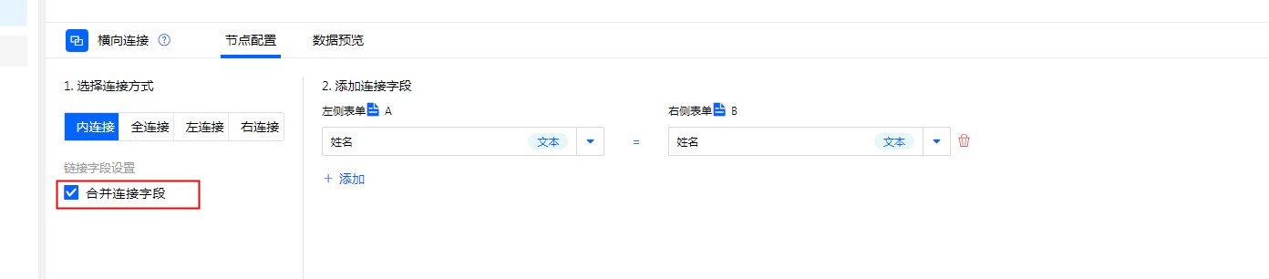 全连接:根据“连接字段”为条件匹配“表单A”与“表单B”,将两边表单数据全部展示。