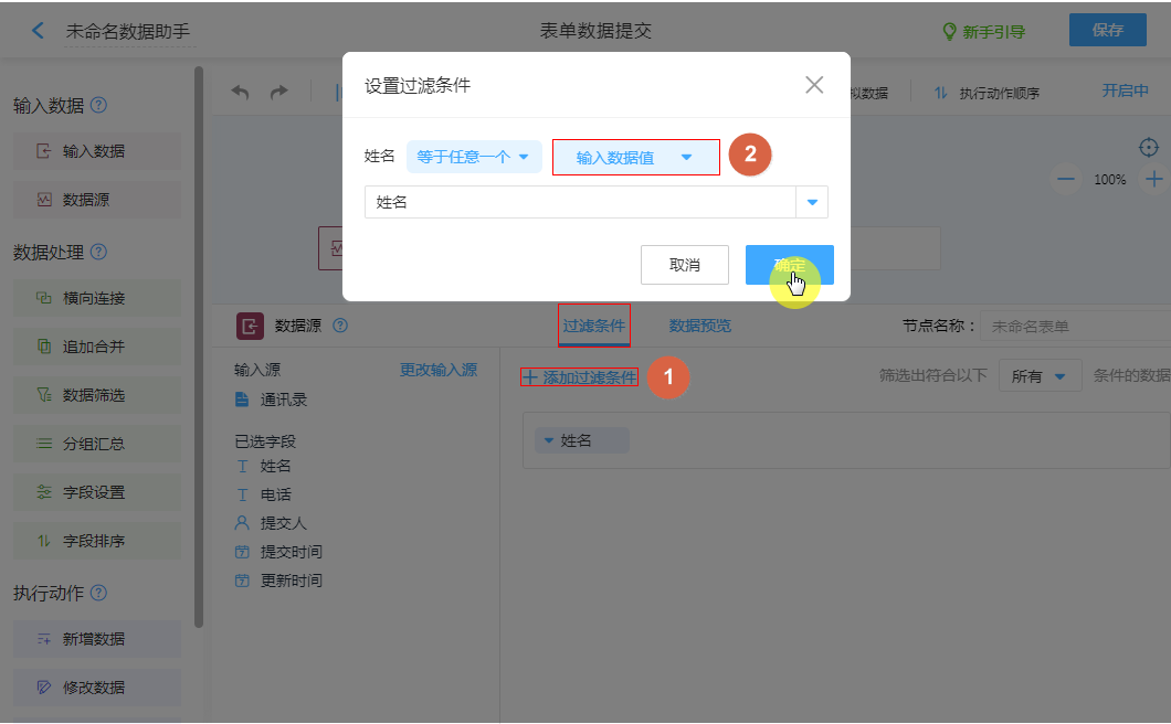 设置表单数据输入值为条件,筛选数据源。